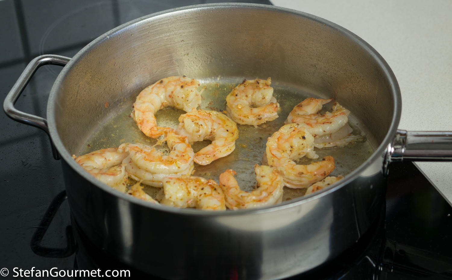 Heat a tablespoon of olive oil in a frying pan. Add the marinated shrimp and cook over high heat for 30 seconds per side.