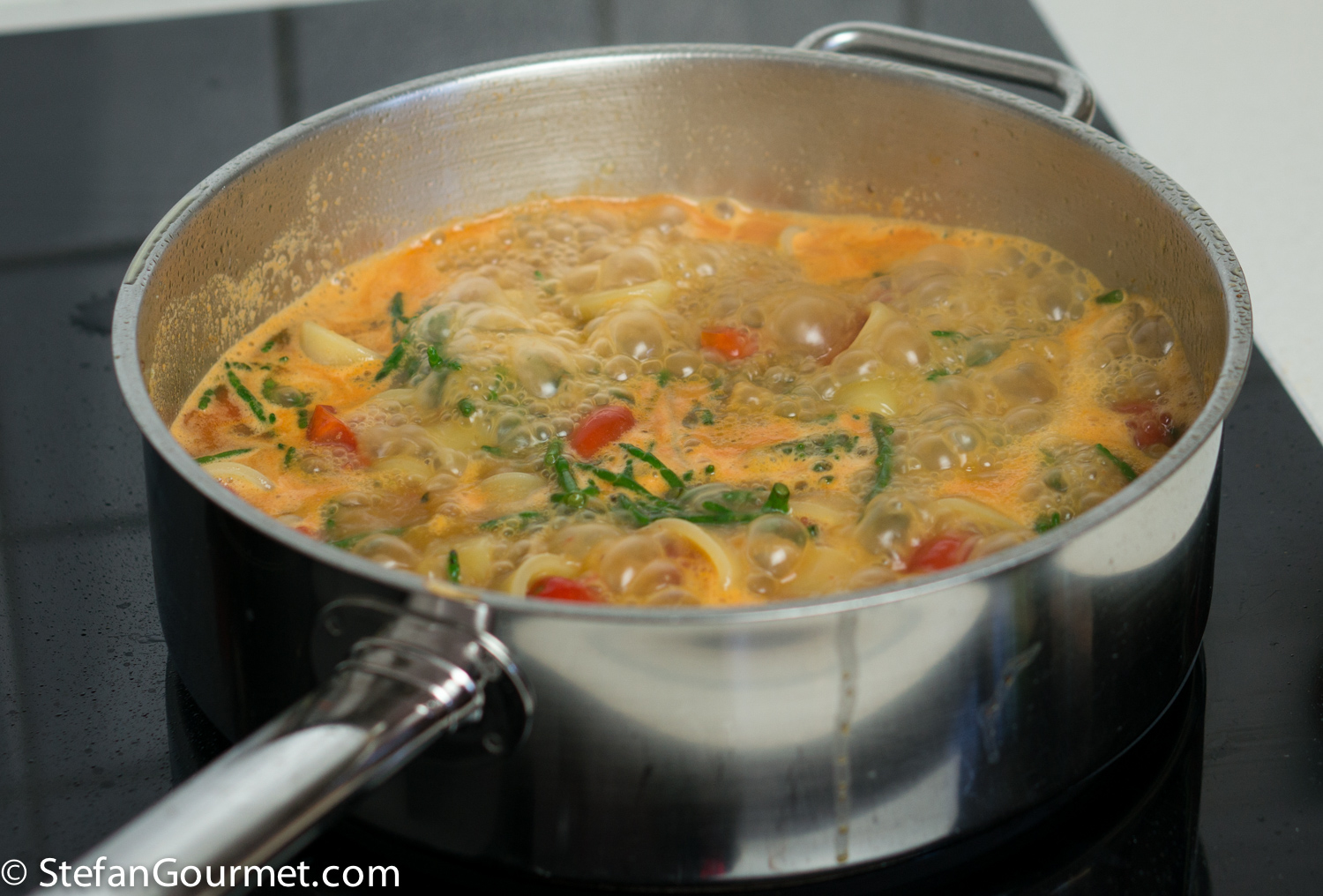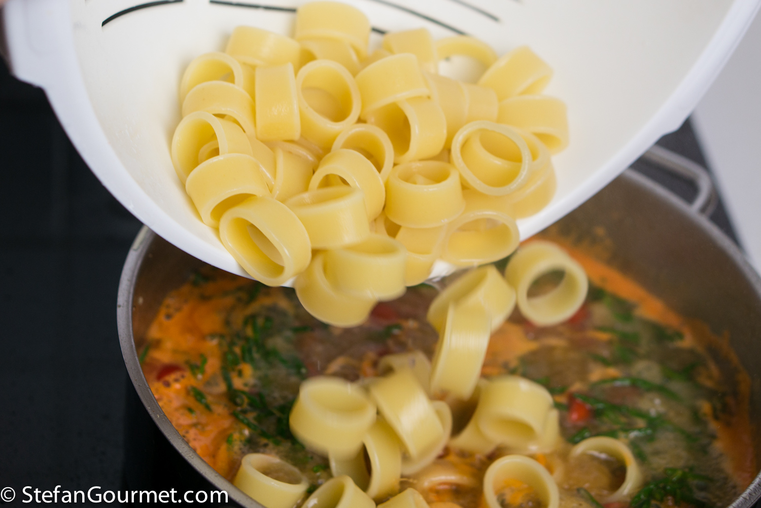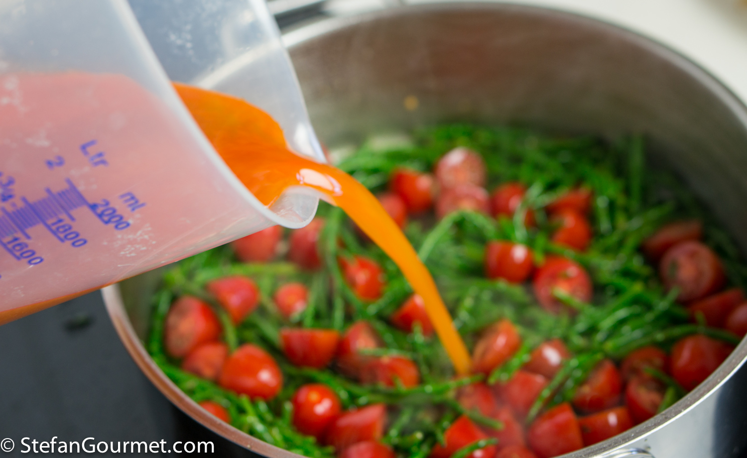 2 minutes before the pasta is al dente, drain and add to the pan with the samphire, tomatoes, and shrimp stock.