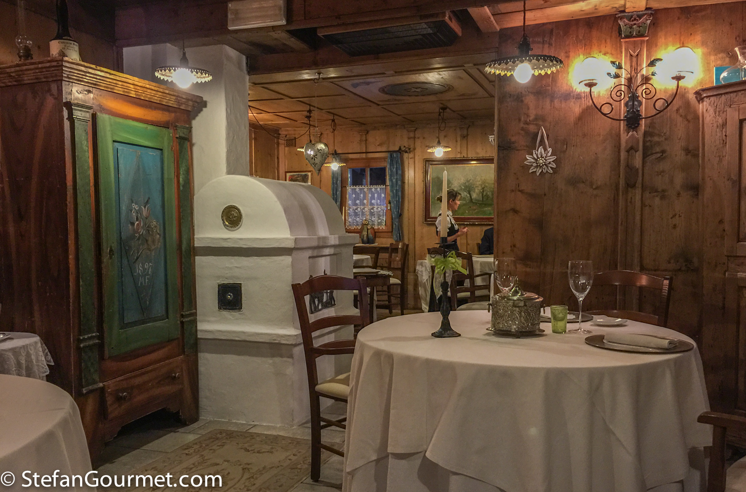 We had been looking forward to going back to Laite again, because we had good memories of our first dinner there in 2010. It is located in Sappada, a mountain town in the far North East of Veneto in the Dolomiti, and run by the couple Fabrizia and Roberto. She cooks, he takes care of the service and the wine. The dining room is very cozy in the local style with antique furniture and lots of wood. We didn’t even look at the menu and just asked Roberto to put something together for us (90 euros for a degustazione).