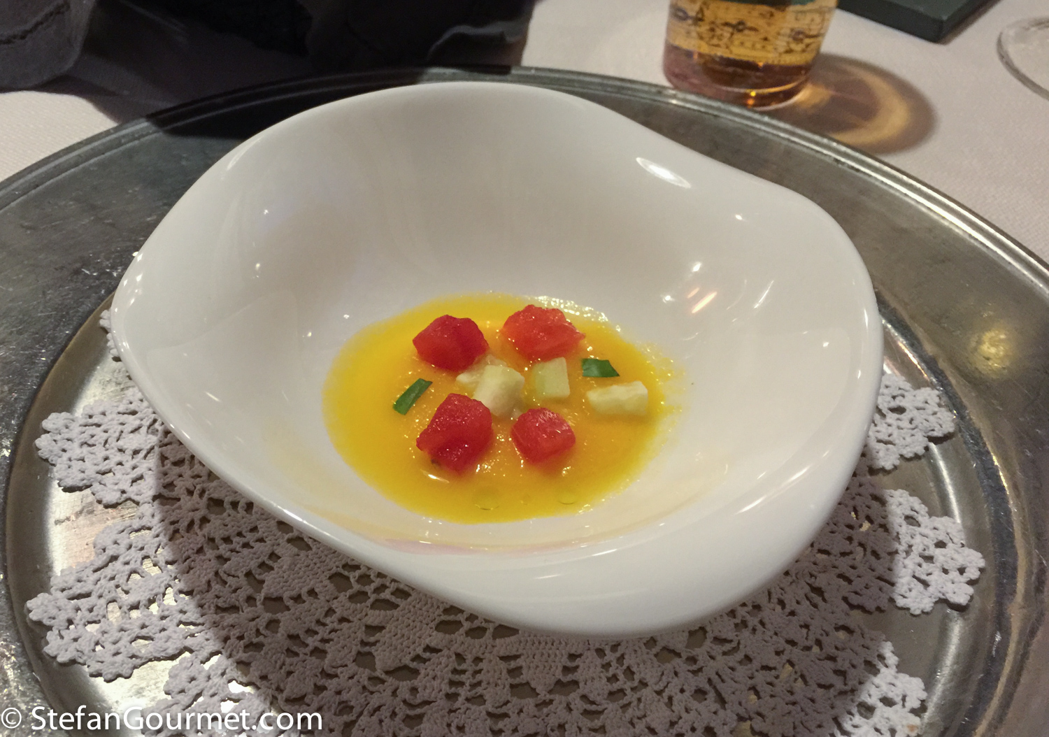 No long series of amuse bouche here, just a single ‘greeting from the kitchen’ in the shape of melon soup with water melon and cucumber. As apertif a glass of a very nice Franciacorta.