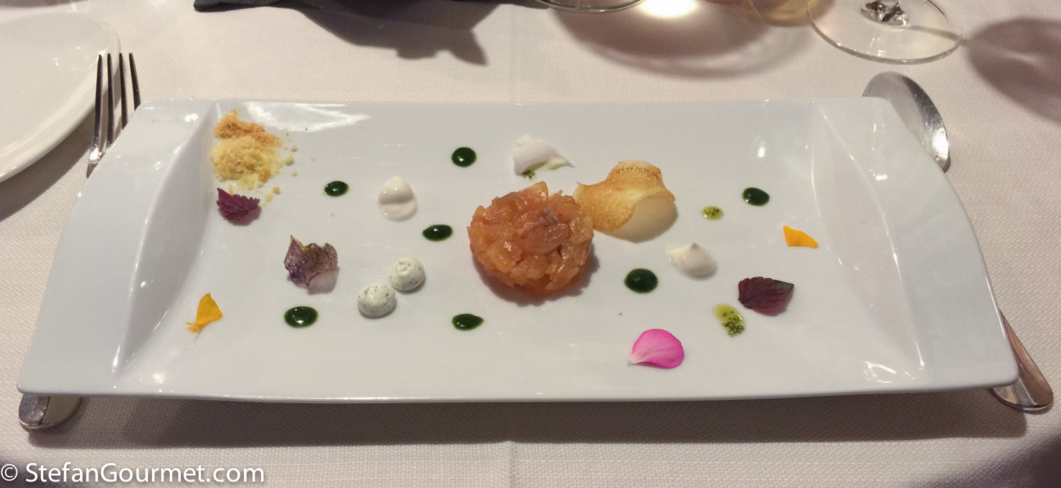 Second course: cannolo made of tomato with semolina. It sounds simple but the combination of the tart tomato with the velvety semolina really works. Although I am usually sceptical about pairing multiple dishes with the same wine (often a compromise), in this case the pairing with the same Garganega is outstanding and brings out the flavors in the dish. 9/10