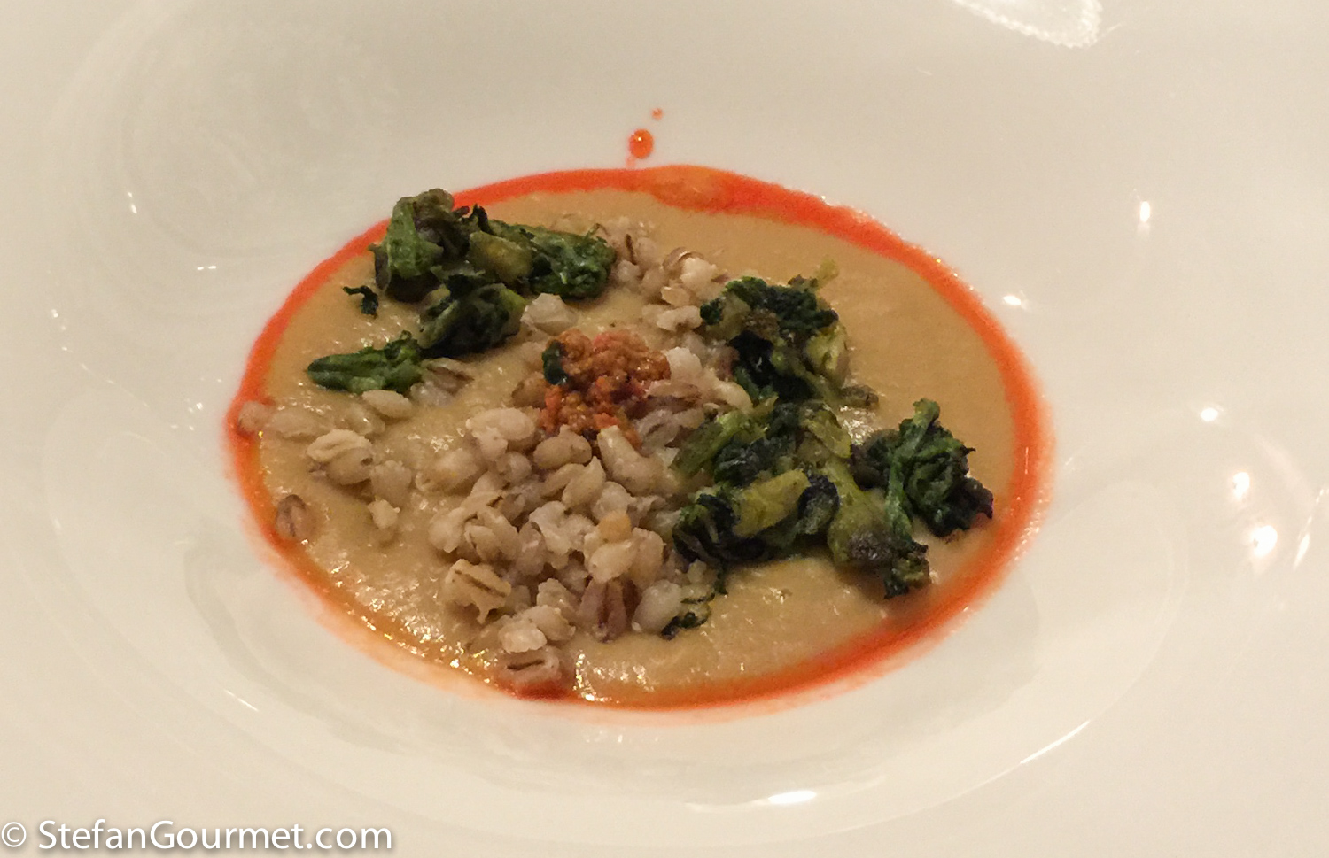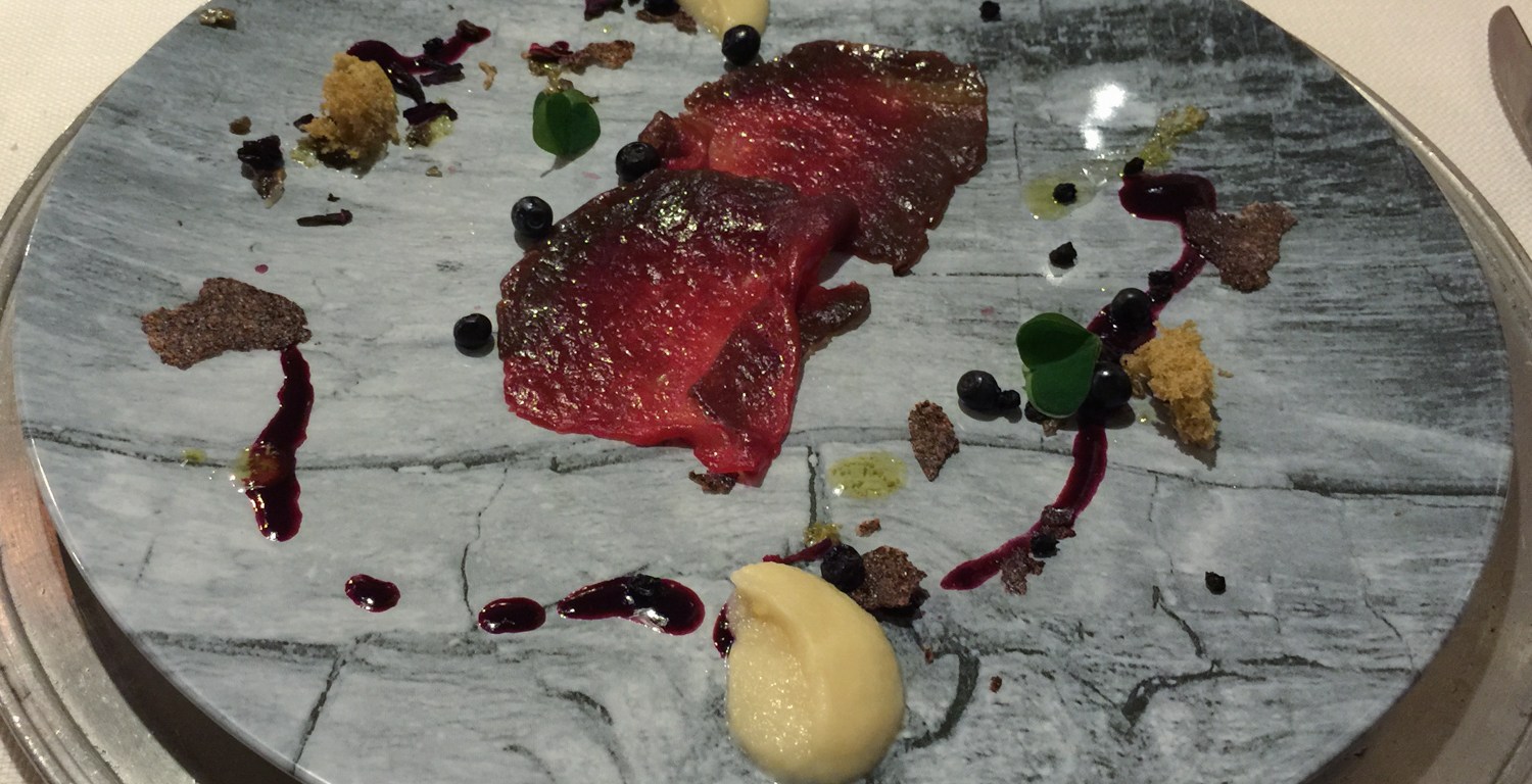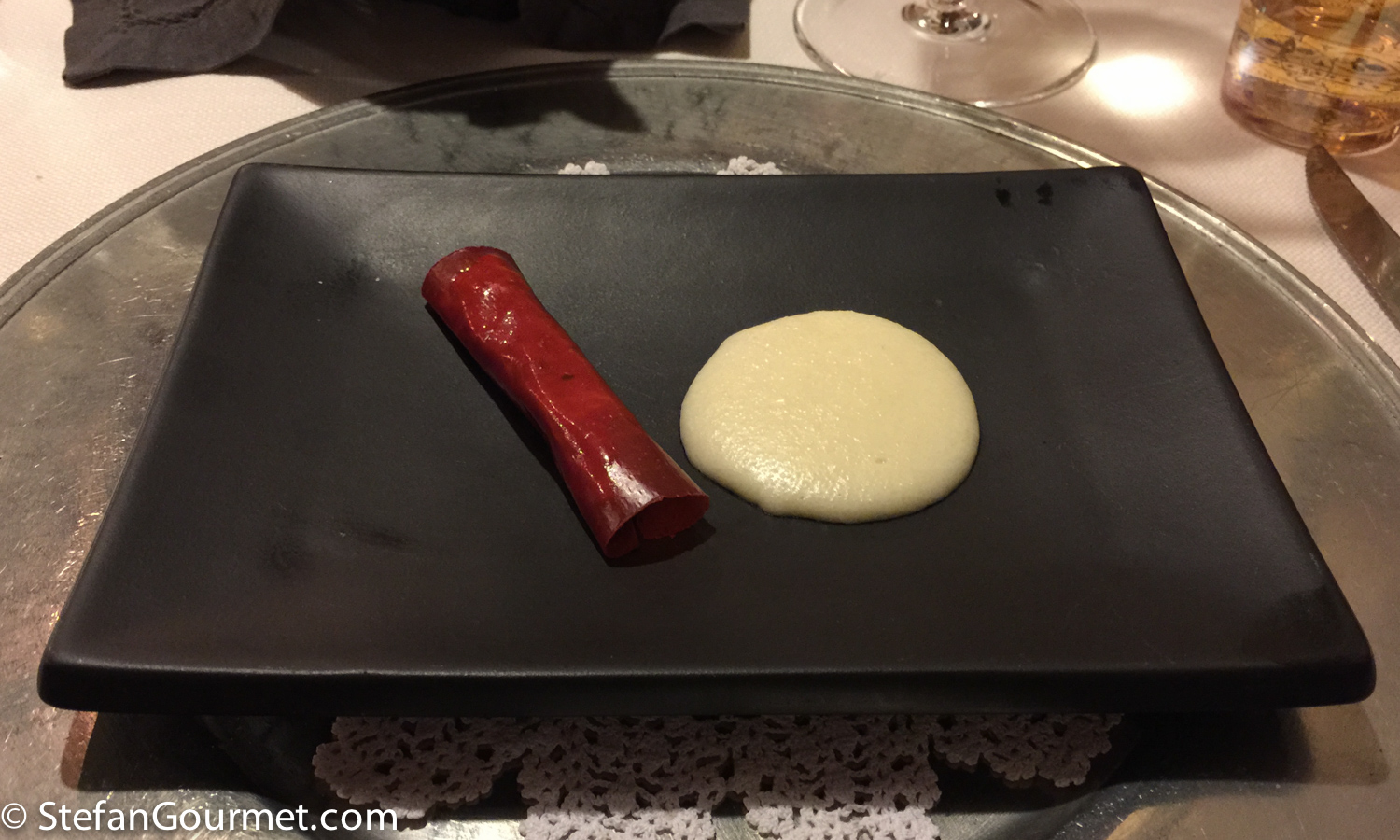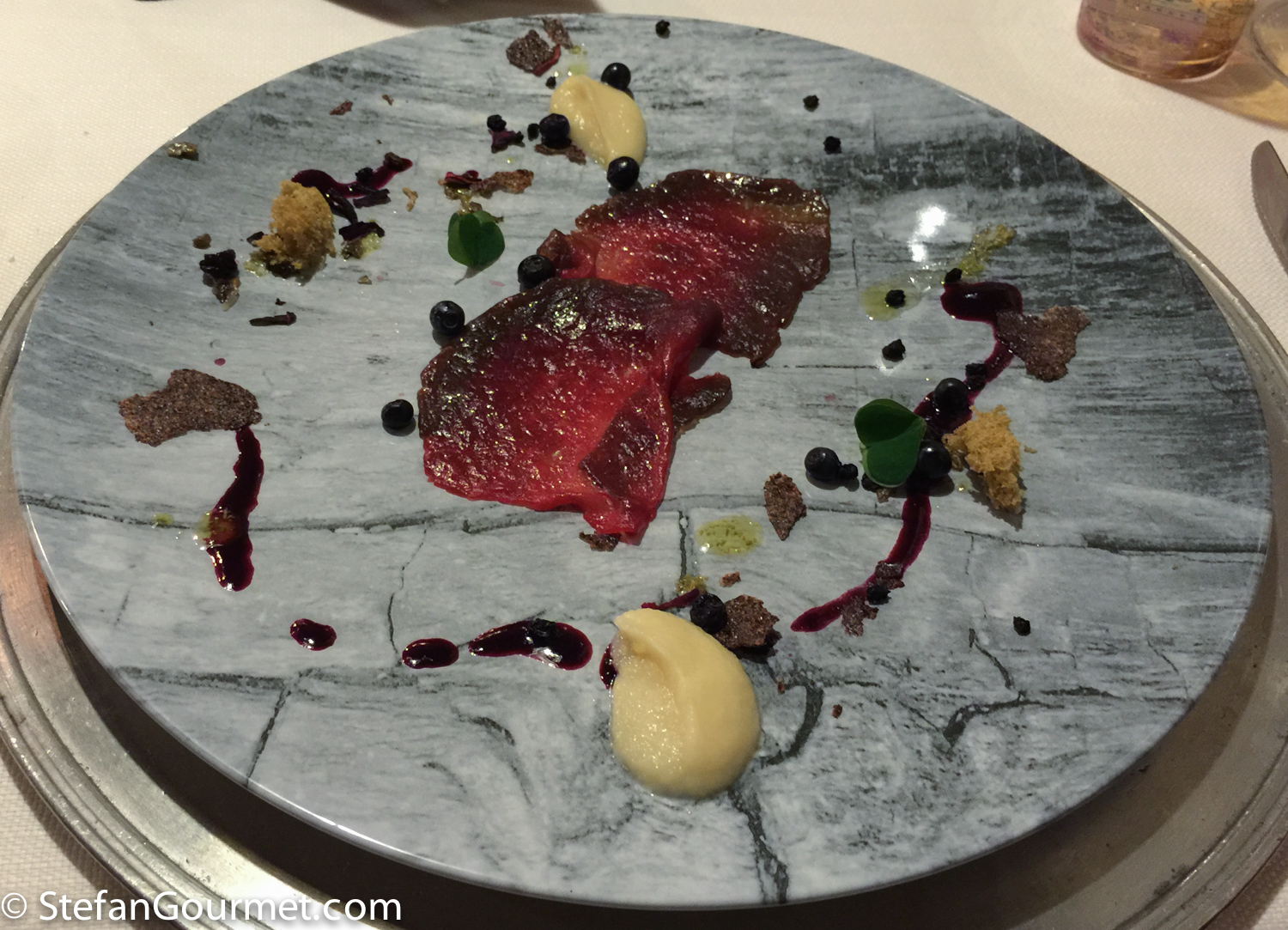 I still remembered the marinated venison tartare from 5 years ago, because it was so good. When I mentioned this, Roberto said a new version would be included in the menu. The venison is cured for 6 hours with salt, sugar, oil, and spices, and is very flavorful. This dish has the forest as a theme, as it is served with fresh and dried berries, ‘bark’, and puree of roots (tasting very similar to celery root). The delicious venison became even more delicious with the berries, and surprisingly enough again the same Garganega (a white wine) brought out the red fruit flavors even more. A great dish, 10/10.