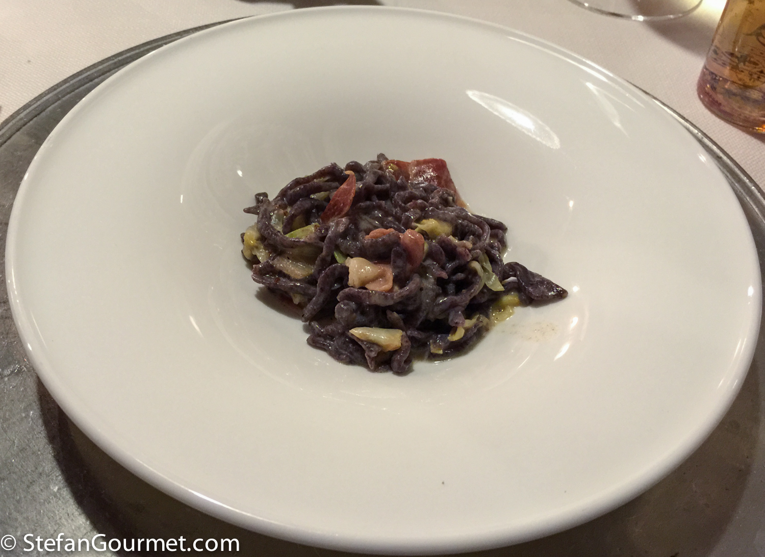 This dish is a cross between risotto and fresh pasta, because the pasta is made from rice flour from riso venere, black rice. With speck (local smoked prosciutto), cabbage, and cumin a very nice dish. This was paired excellently with an aged Riesling/Chardonnay from Piemonte. 9/10