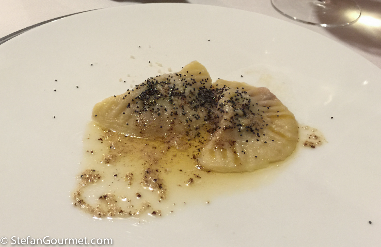 The local tortelli, filled with speck and a butter sauce with poppy seeds. Paired very well with the same wine. 8/10