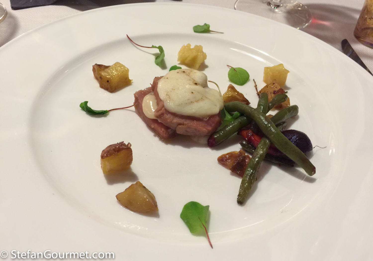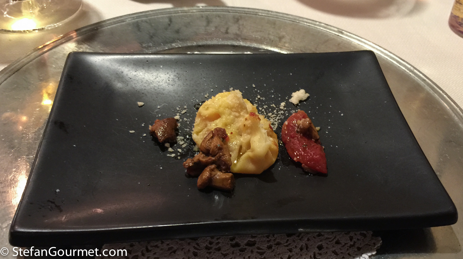 The first course has the local stream (torrente) as a theme. Salmerino (beech trout), lightly smoked, with trout bottarga, ‘rocks’ made of meringue, a cream of the nettles that grow along the stream, and a powder that creates the sense of the pebbles moving on your tongue. Paired nicely with a Garganega from Veneto, Capitel Croce by Roberto Anselmi. This Garganega is matured in wood, which sets it apart from the usual dry style of Soave and that is exactly what is needed for the ‘creaminess’ of the fish. 9/10