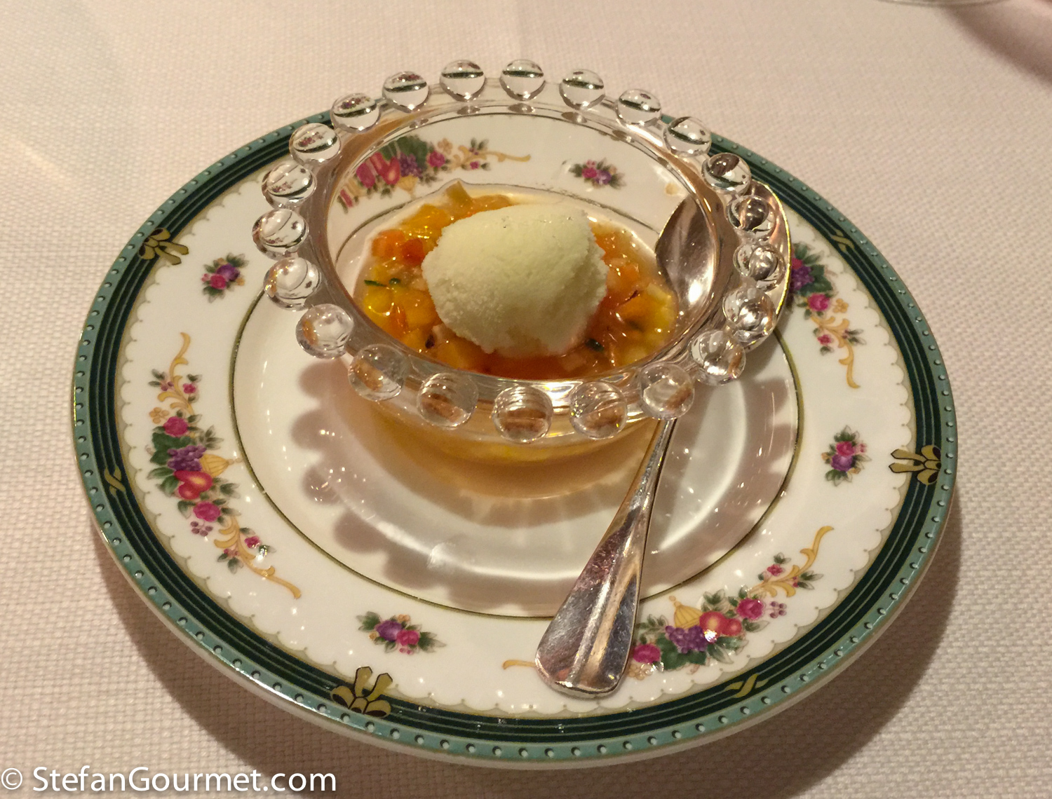 Olive oil ice cream with a fruit soup as a very nice palate cleanser.