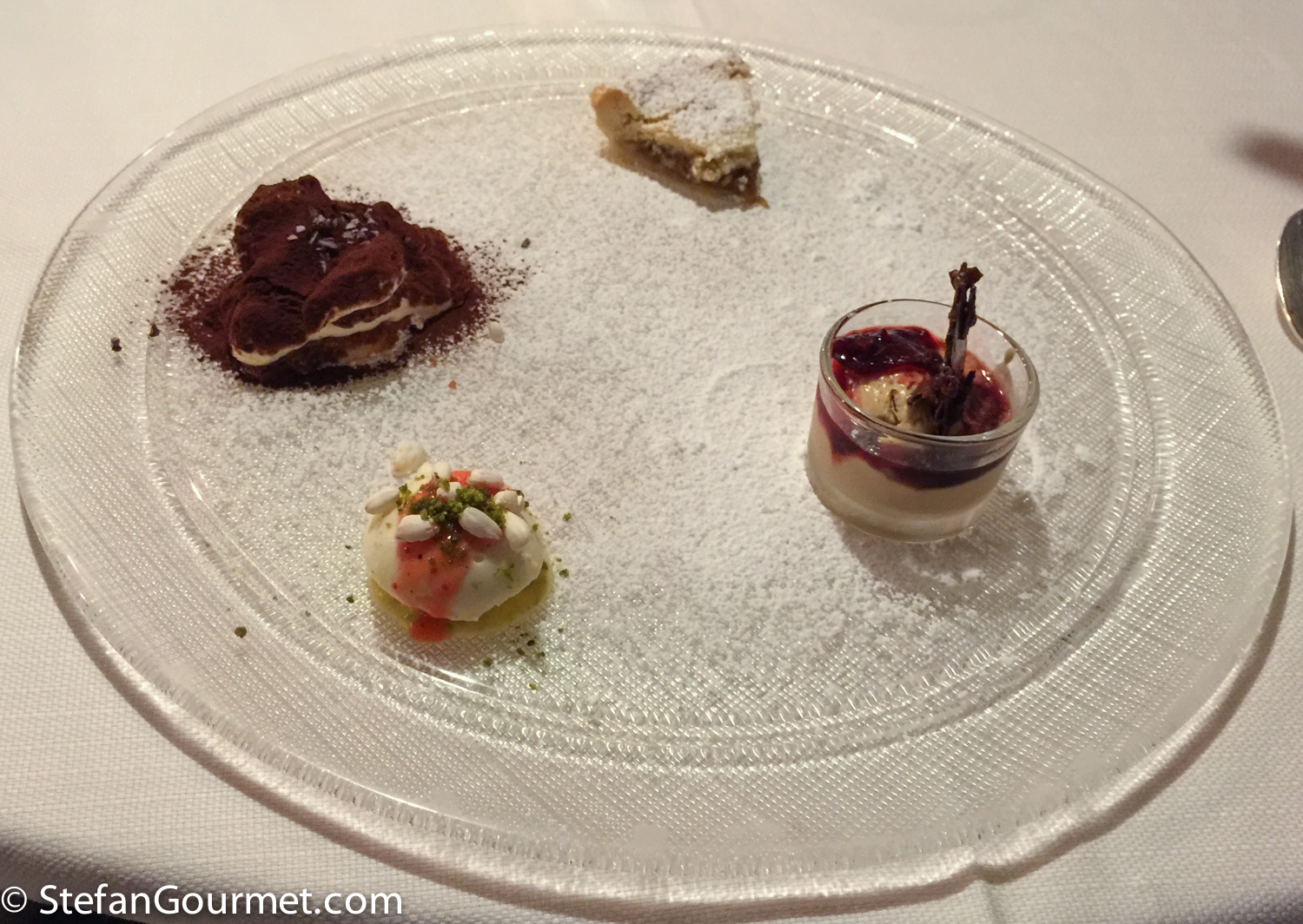 A sampler of four desserts, served with a Recioto della Valpolicella. The recioto worked best with the tiramisù and the zabaglione. The tiramisù was interesting because the ladyfingers were in part still crunchy. My favorite was the almond pie. A nice set of desserts, 9/10.