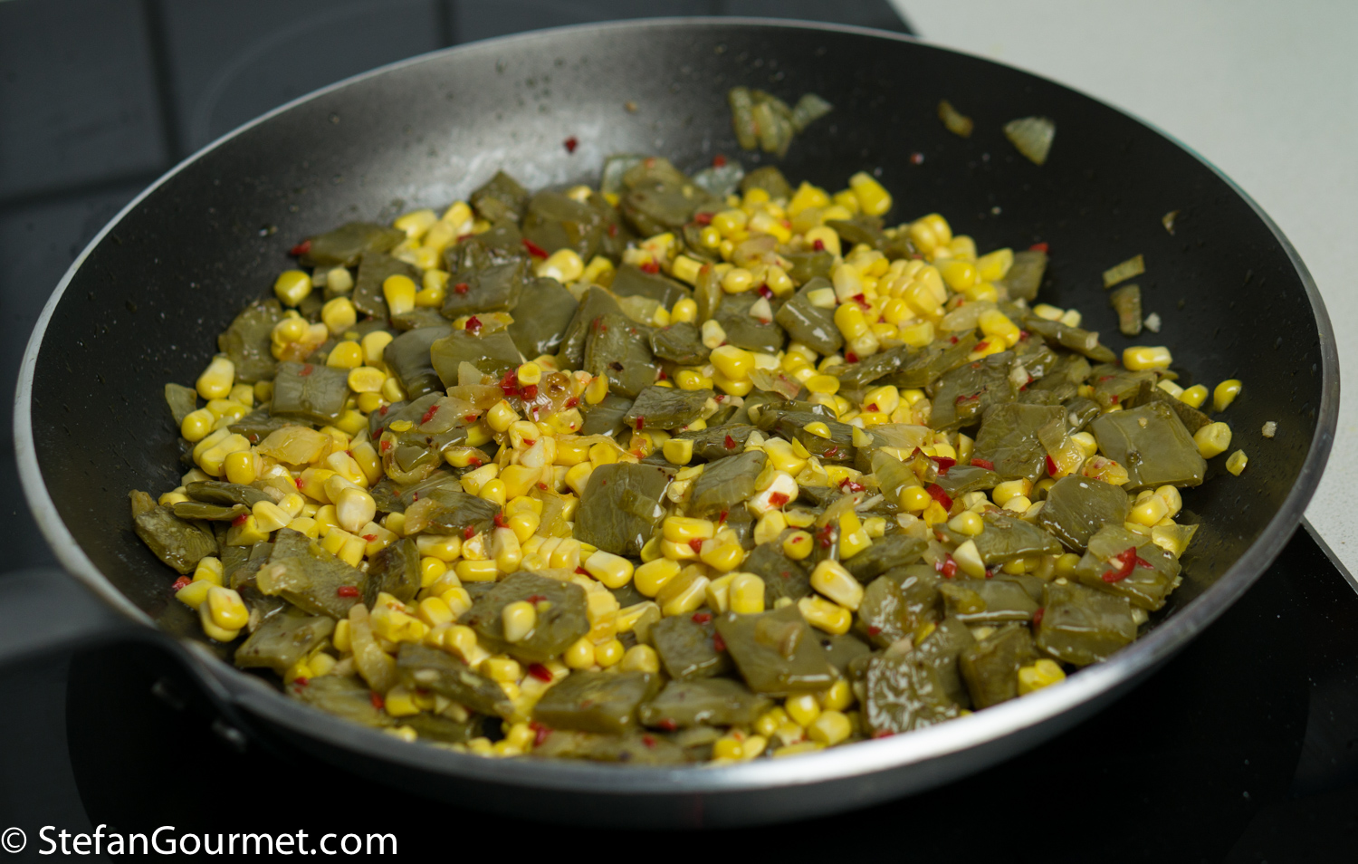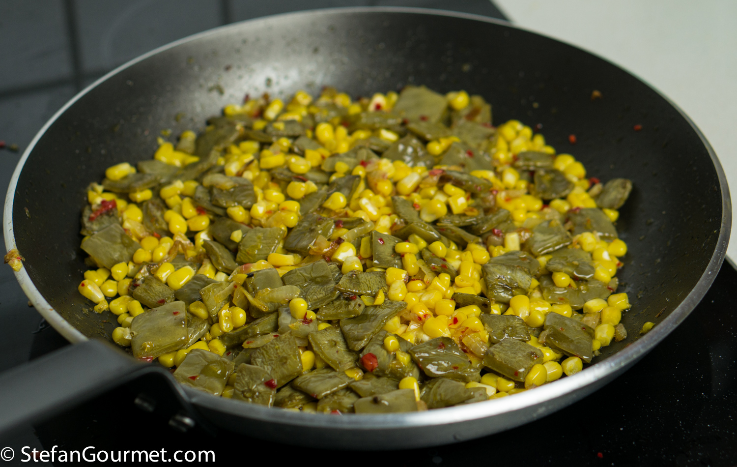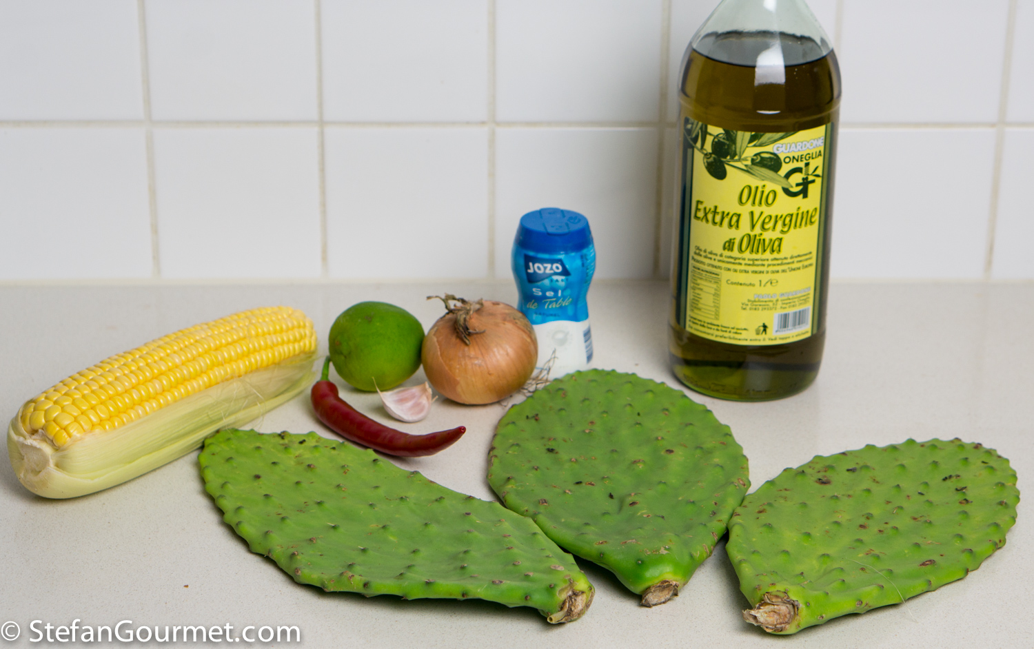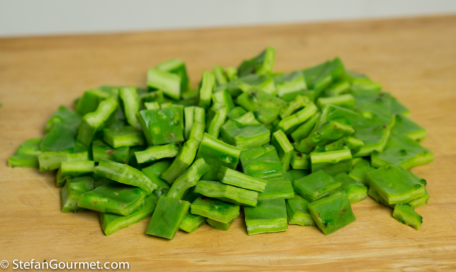 I’m always interested in trying new foods. And so I was intrigued when Richard posted a recipe for cactus on his wonderful blog REMCooks. Richard is a great connoisseur of Mexican cuisine, and his recipes are always delicious. Once you remove the spines, the cactus is fine to eat. There is only one issue. In Texas and Mexico cactus plants grow like weeds, but in the Netherlands it is too cold for them. I had seen cactus paddles at the specialty market a few times, but they never seemed fresh. Until the other day. And so I grabbed them, and prepared them using Richard’s recipe as a basis, with some modifications. When we tasted the dish, we thought the cactus and corn needed something to bring their flavors together. To stay within the Mexican theme, I tried ground coriander seed, and it worked like a charm. The result was very nice. The cactus tastes a bit like beans, but has slightly more flavor and a bit of tartness to them. They are crunchy on the outside and soft on the inside, and together with the coriander work very well with the sweet corn and the spiciness of the chilli. Here’s what I did…