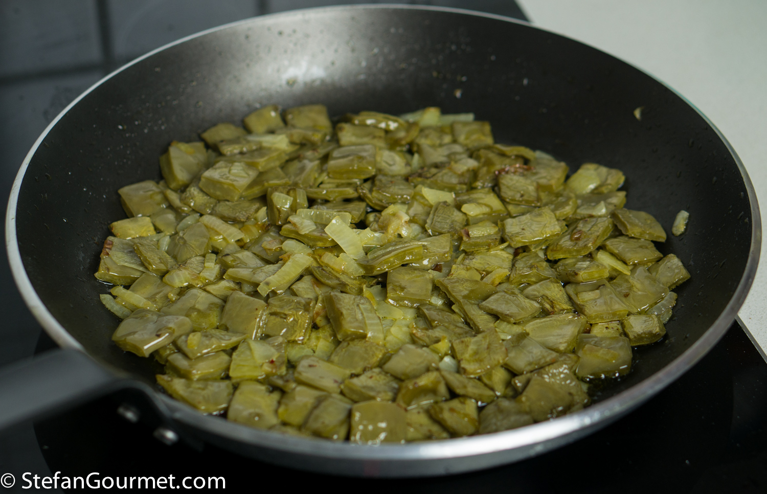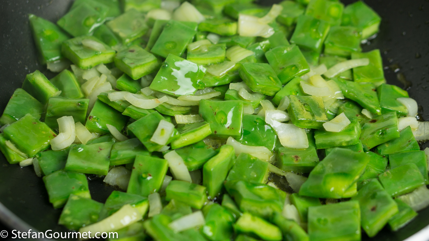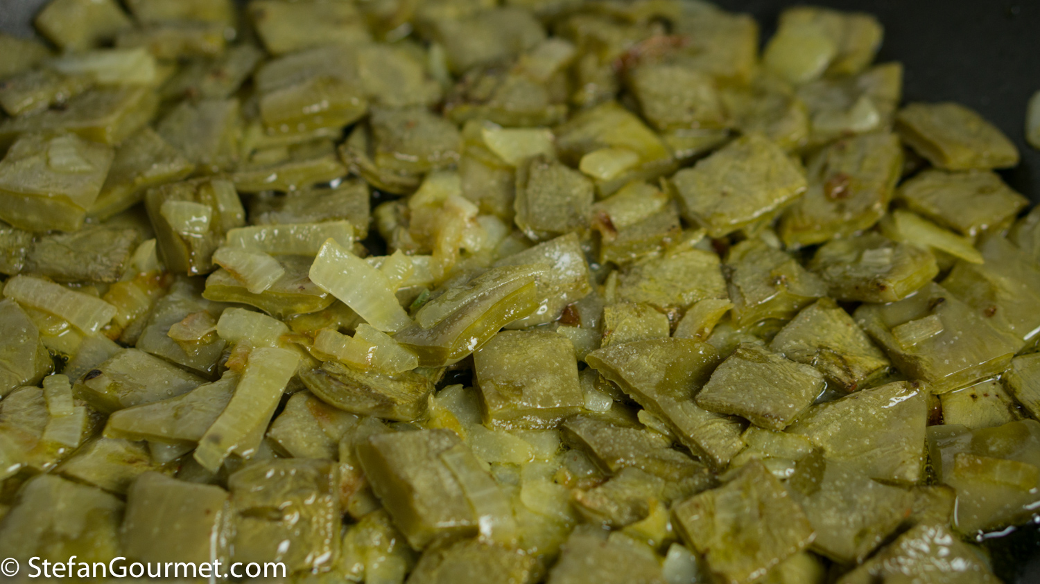 Sauté the cactus paddles with onion in the olive oil over medium high heat for a couple of minutes.
