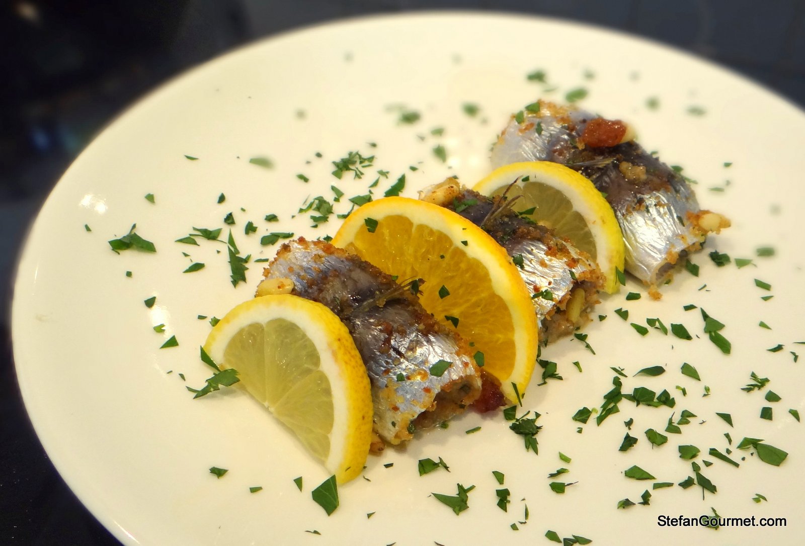 Sarde a Beccafico is a great dish from Sicily. Sardines are stuffed with bread crumbs, raisins, anchovies, parsley, pine nuts, sugar, and baked in the oven with some orange juice. This dish is very tasty and easy to prepare if you ask the fishmonger to turn the sardines into fillets for you.