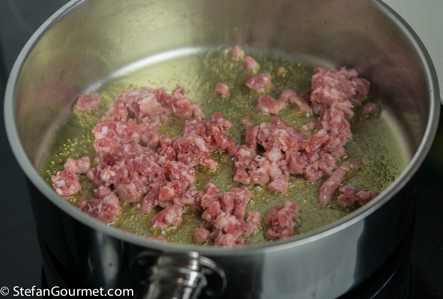 Add 150 grams (.33 lb) sausage meat to the garlic-infused oil.