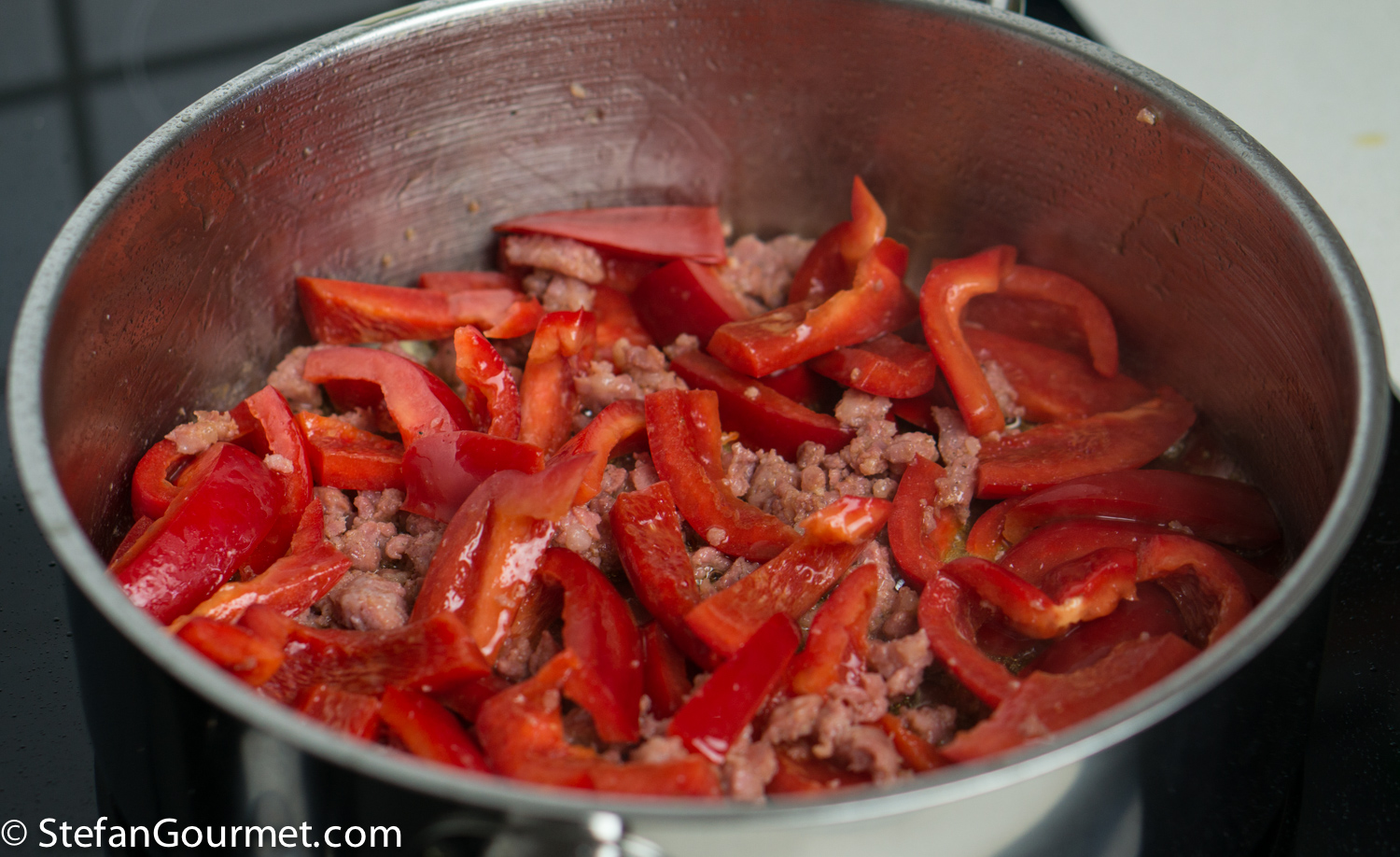 Add 2 red bell peppers cut into strips, and stir for a minute.