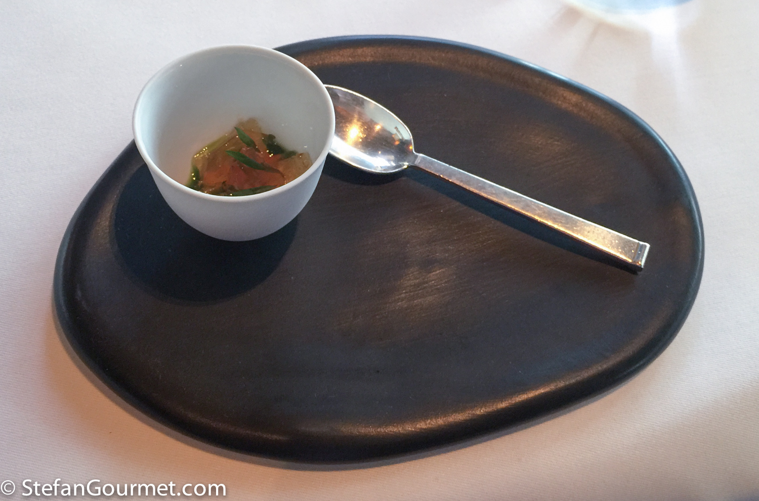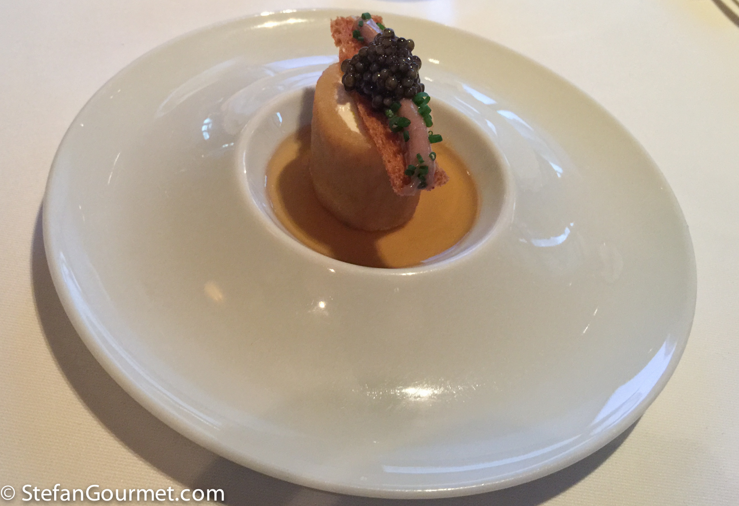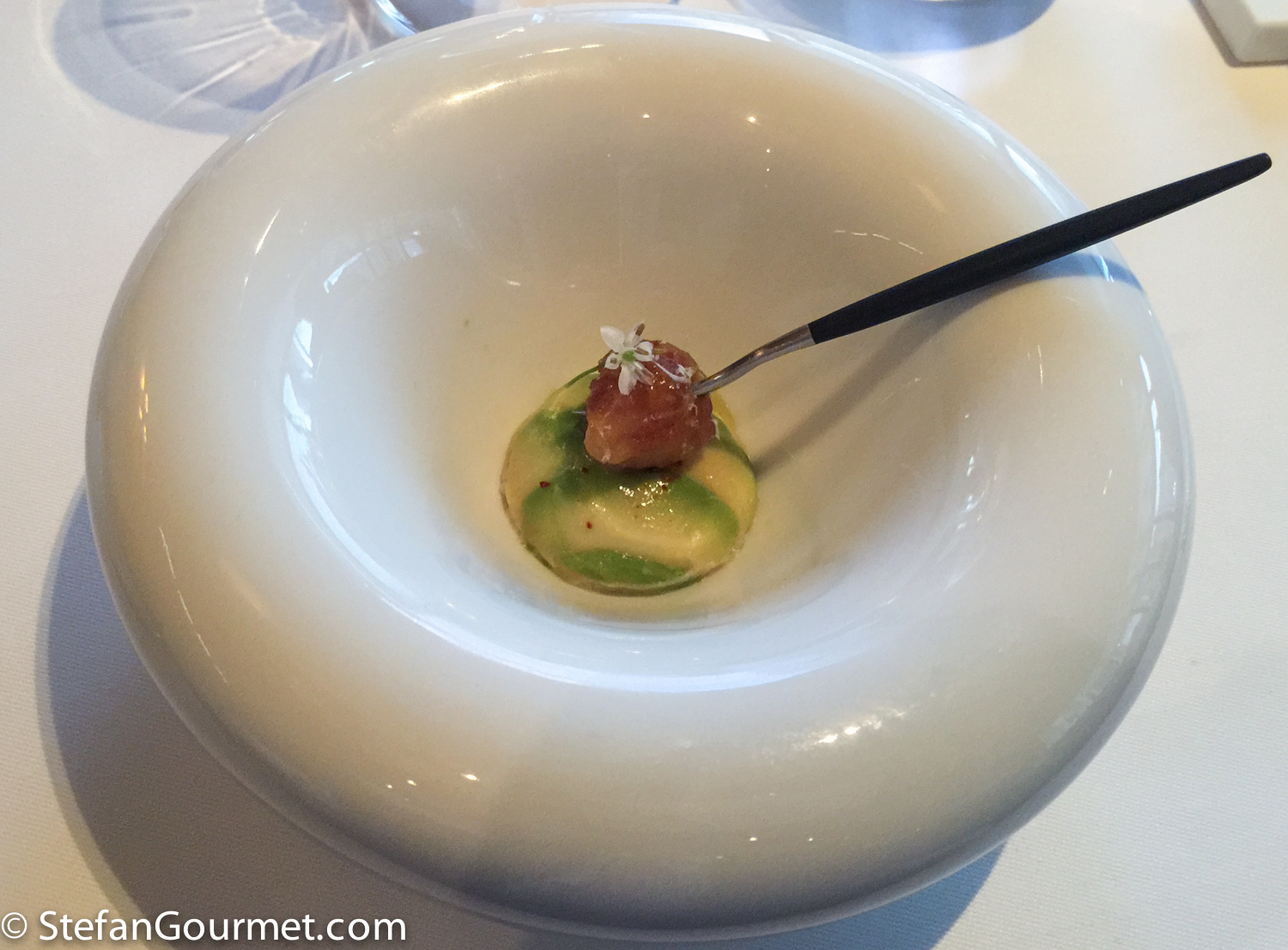 Another miniature version of one of the chef’s signature dishes: veal marrow with Beluga caviar on a crunchy cracker with a ‘bone’ made out of potato stuffed with veal tartare. Still as delicious as ever. The set of amuse bouche is a great start of the meal, which clearly shows the chef’s style. 9/10