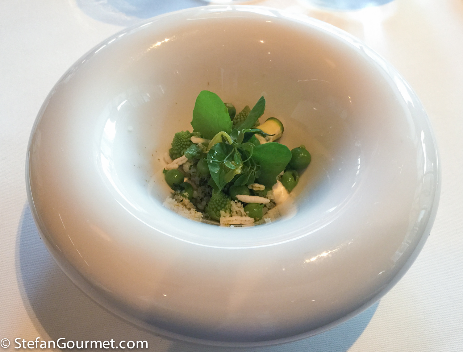 A miniature version of one of the chef’s signature dishes: seasonsal vegetable salad with Pierre Robert cheese.