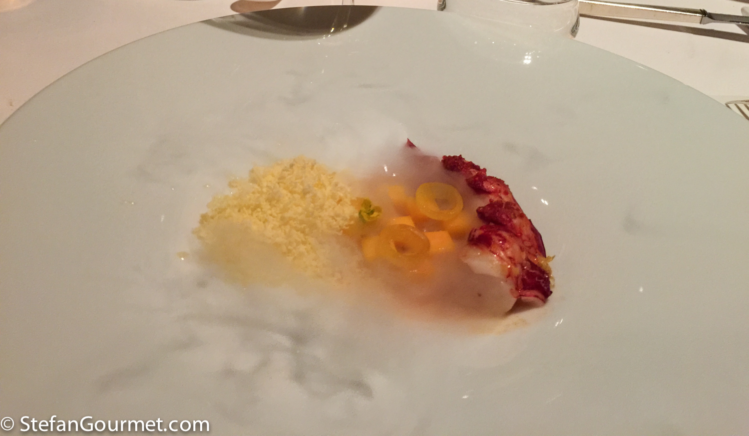 Lobster with mango, both cubes of perfectly ripe mango and frozen mango. A nice combination, although I thought the lobster was just a tad rubbery, paired excellently with a Savennières, a chenin blanc from the Loire valley. Although the wine wasn’t sweet, it could easily handle the mango and the combination was just perfect. 9/10