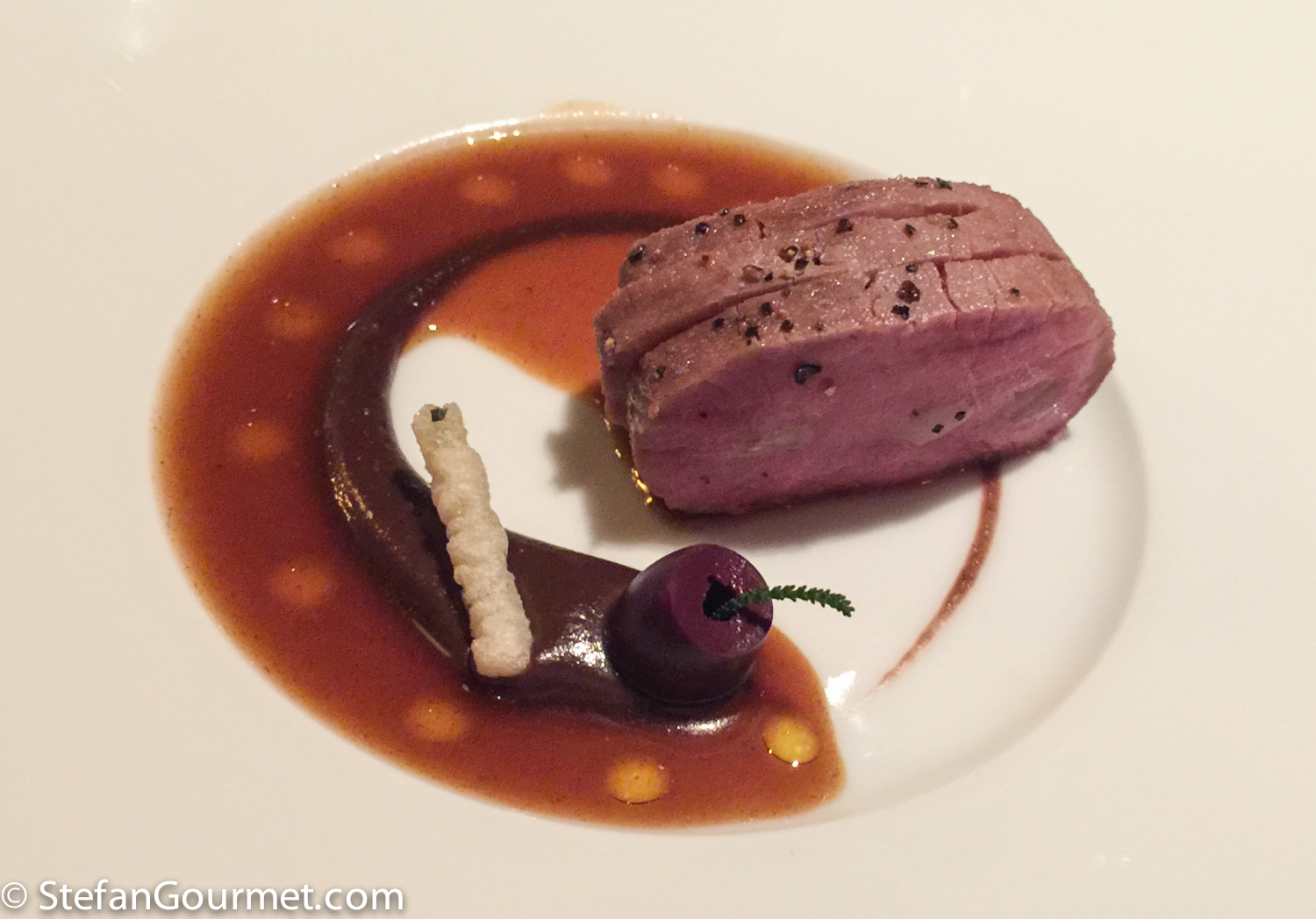 Oops, I neglected to take a photo of the following dish. It was a steamed sole fillet, served with clam juice and thin slices of raw mushroom. Paired with a very nice chardonnay from Hemel & Aarde in South Africa.