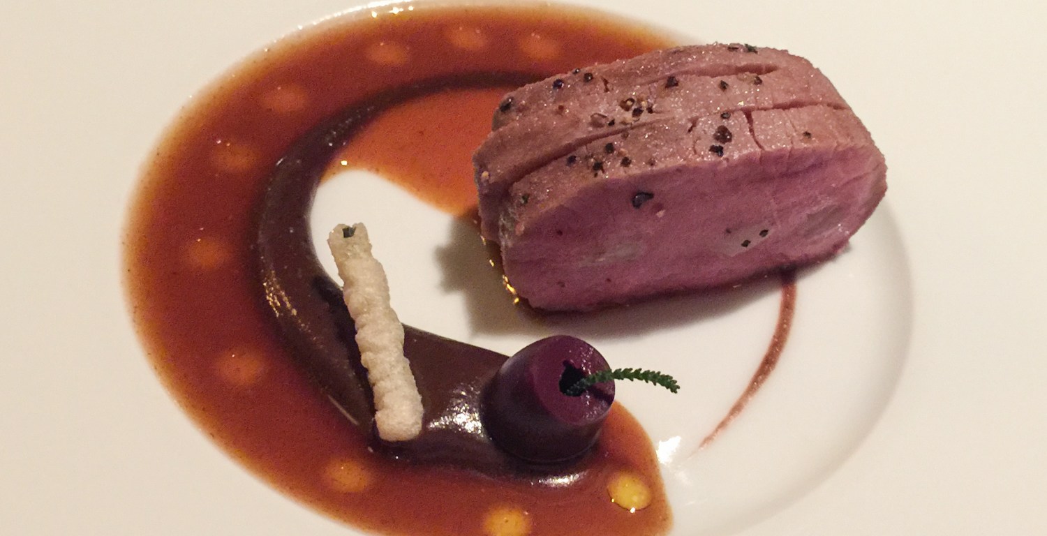 First course: raw mackerel with quinoa, tarragon cream and tomato broth. A very nice combination of flavors and textures, paired well with an oaked Semillon/Sauvignon from Graves. A nice contrast between the creaminess of the mackerel, the tartness/sweetness of the tomato, the crunchiness of the quinoa, and the aniseed aroma of the tarragon. And the wine worked with all of that. 9/10