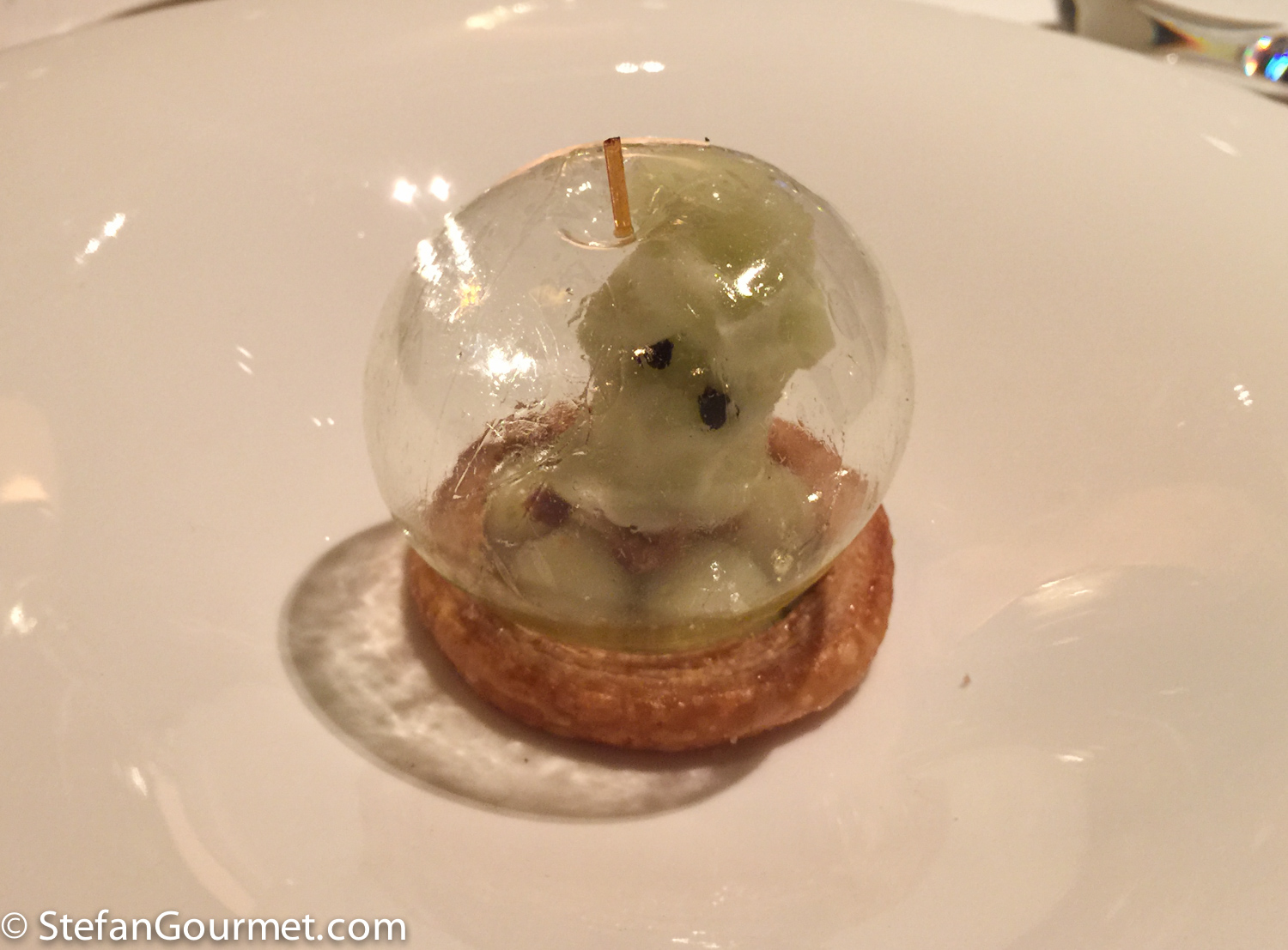 Dessert amuse: another miniature version of one of the chef’s signature dishes. The apple core is made of apple sorbet, with chocolate seeds.