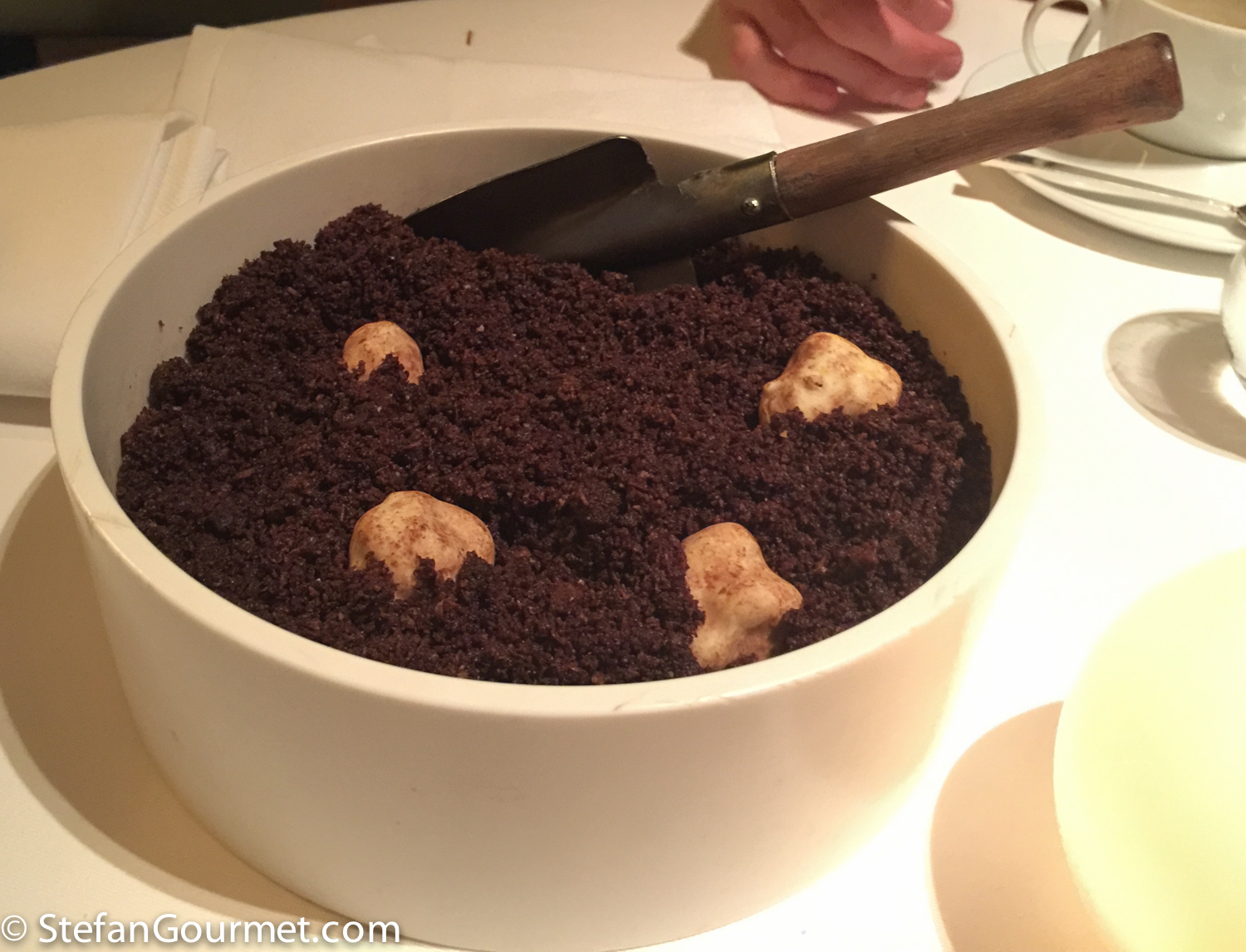 We still had some room, and so couldn’t pass on the cheese cart with a good selection of Dutch and international cheeses, served at the right temperature and ripeness. The sommelier paired each personal selection of cheeses  with a matching wine. I had selected blue cheeses, which were paired with a Trockenbeerenauslese from Chardonnay and Welschriesling.