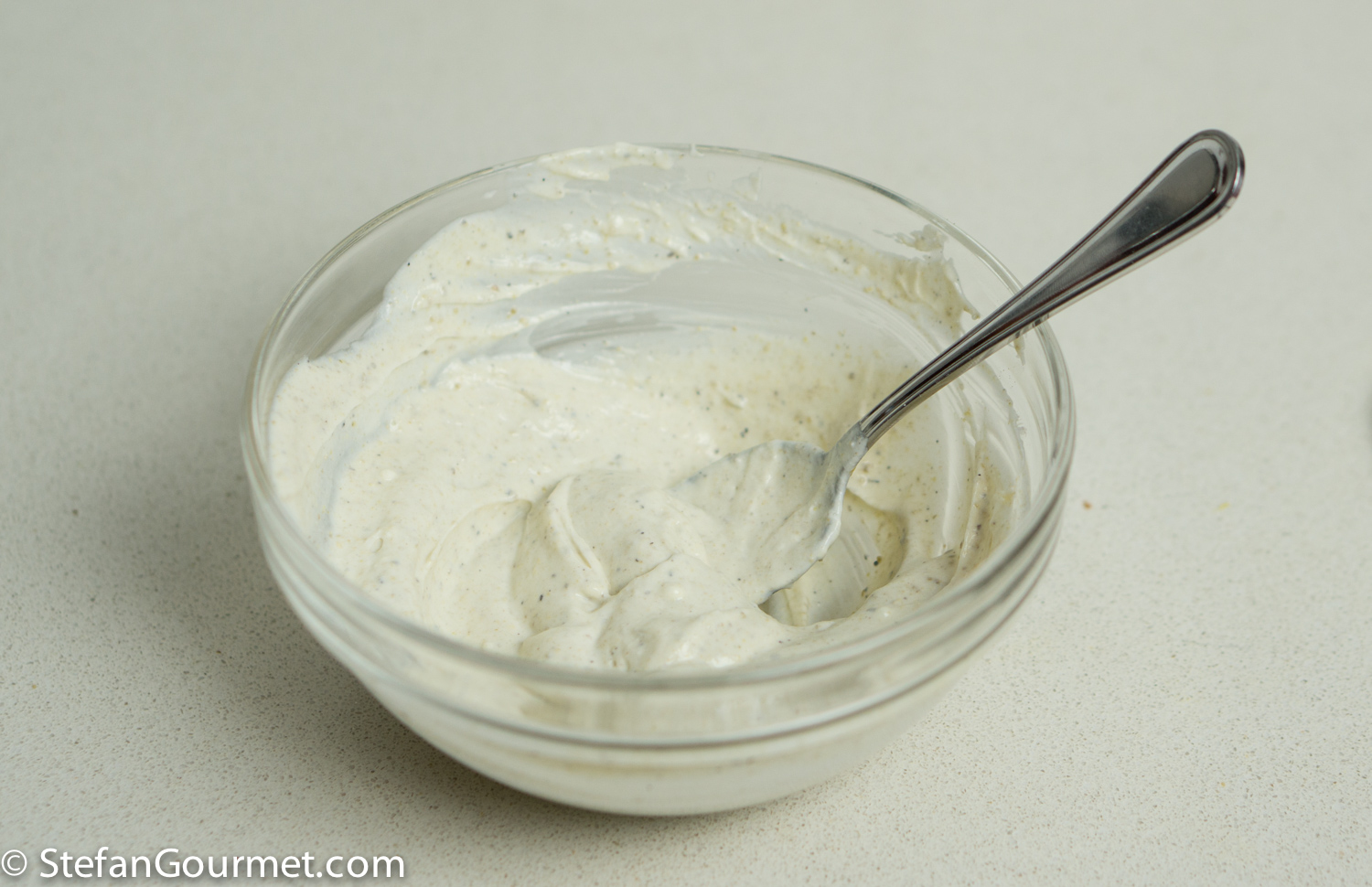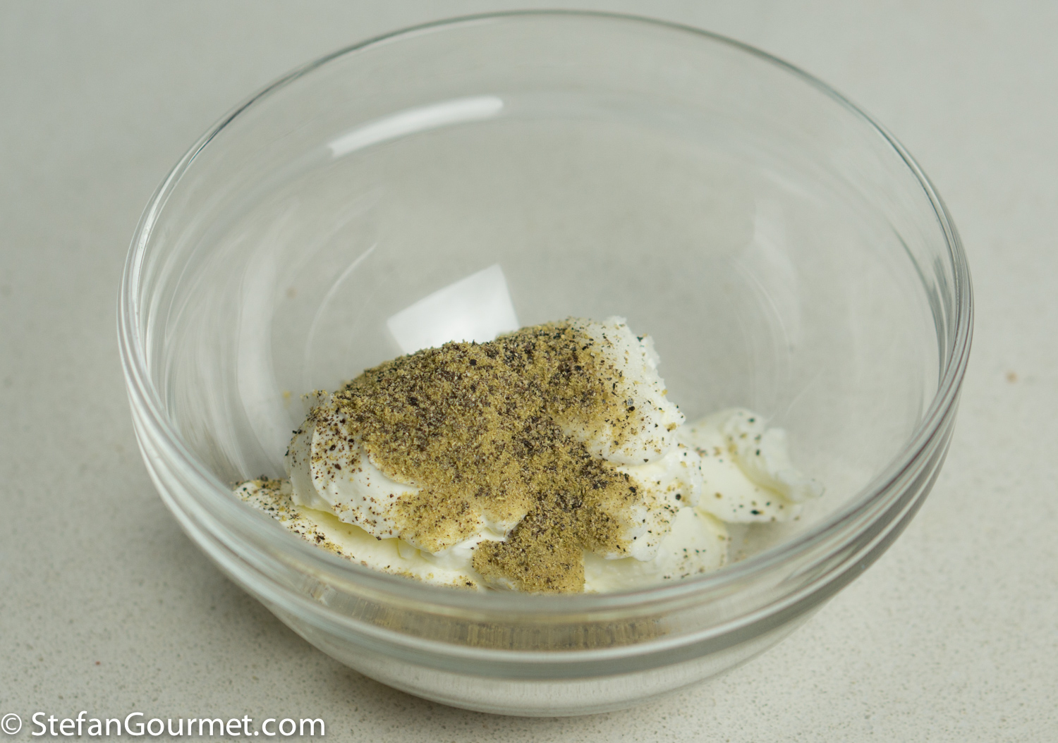 Combine 60 ml (1/4 cup) greek yogurt with 1 tsp ground fennel seed, 1/2 tsp salt, and freshly ground black pepper to taste.