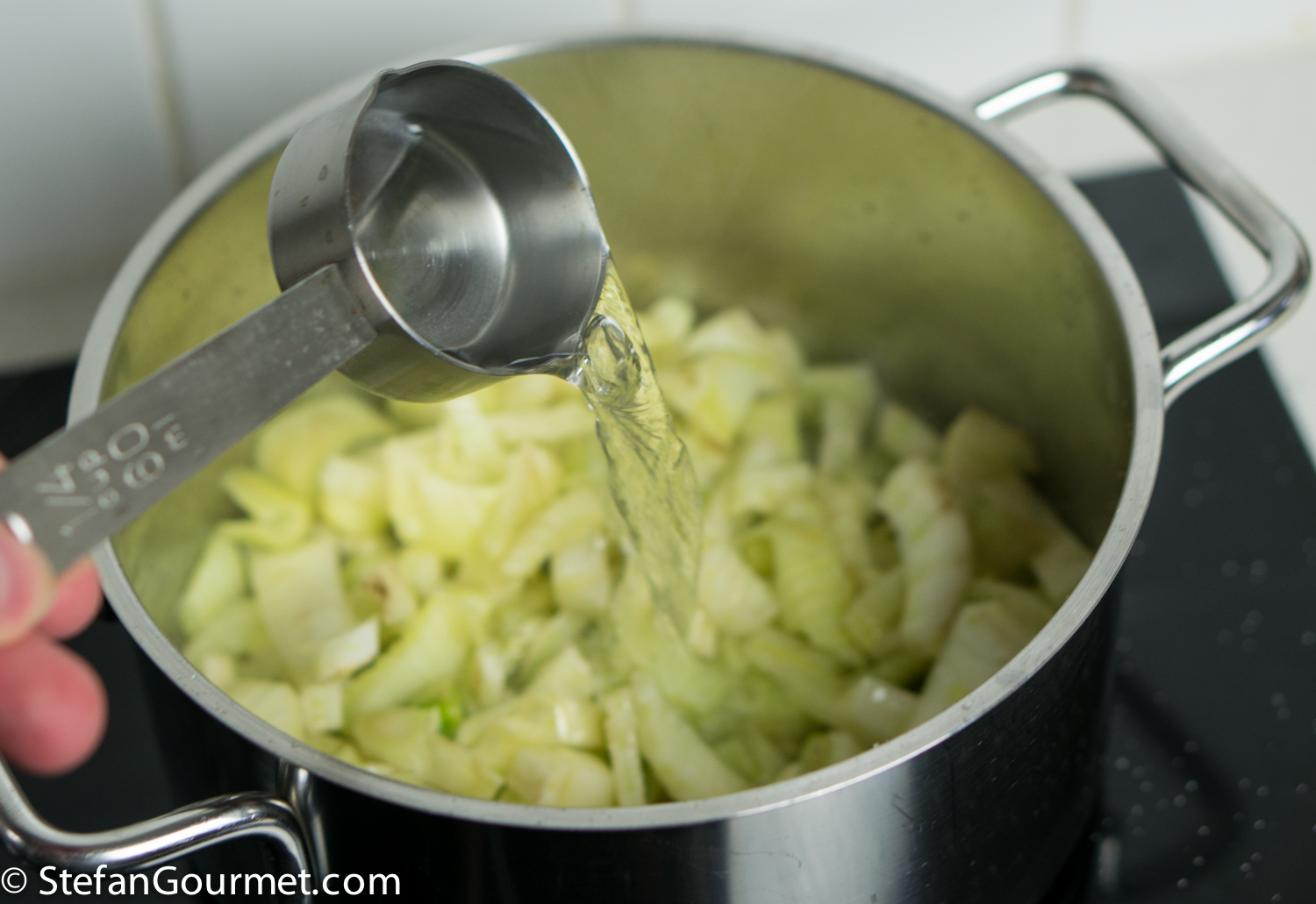 Heat a tablespoon of (clarified) butter in a saucepan. Add the fennel, stir briefly, and add 60 ml (1/4 cup) of water.