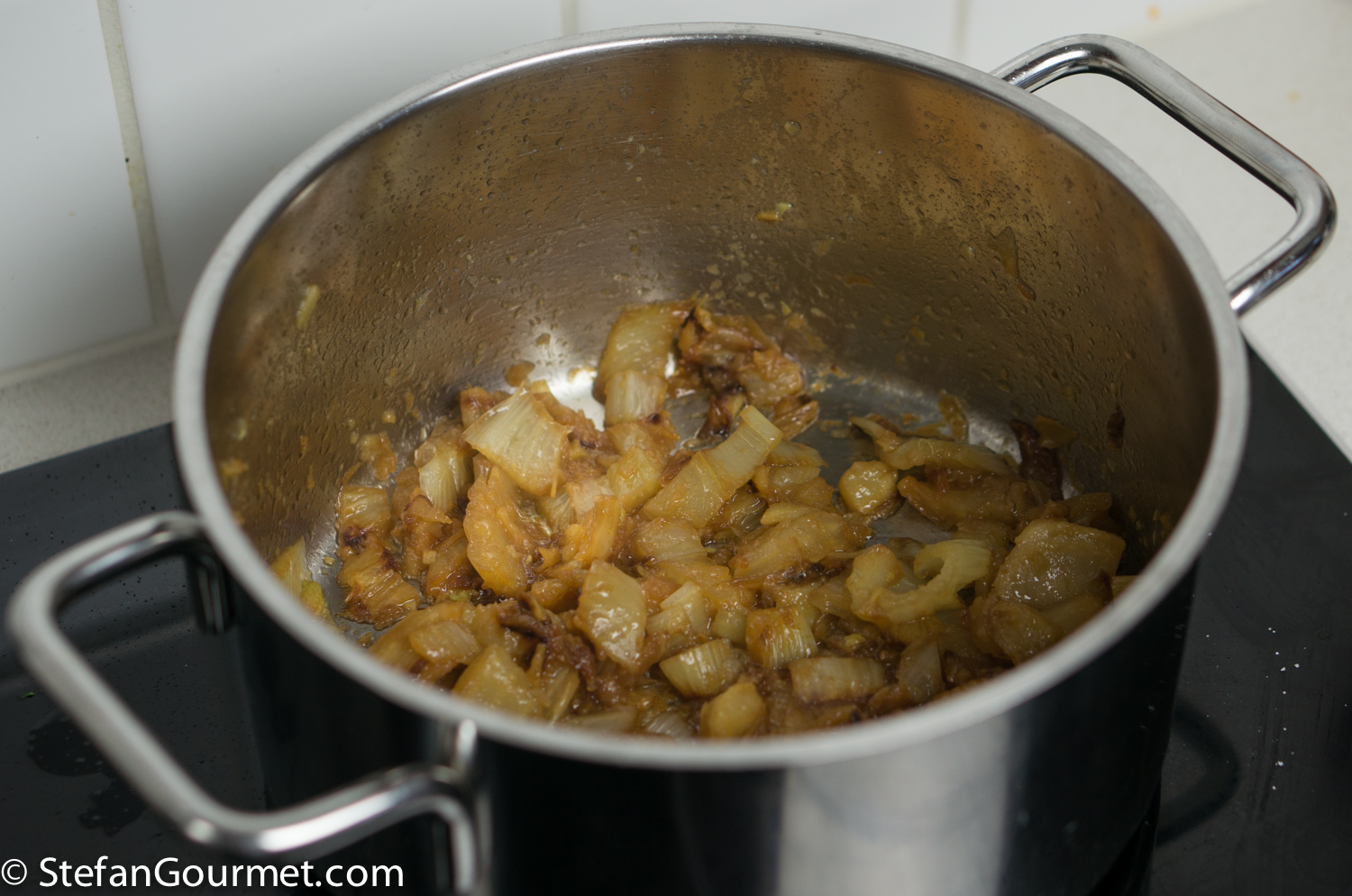 This is what the fennel should look like after an hour or so. If it has not caramelized sufficiently, increase the heat a little until it does. Make sure to keep stirring.