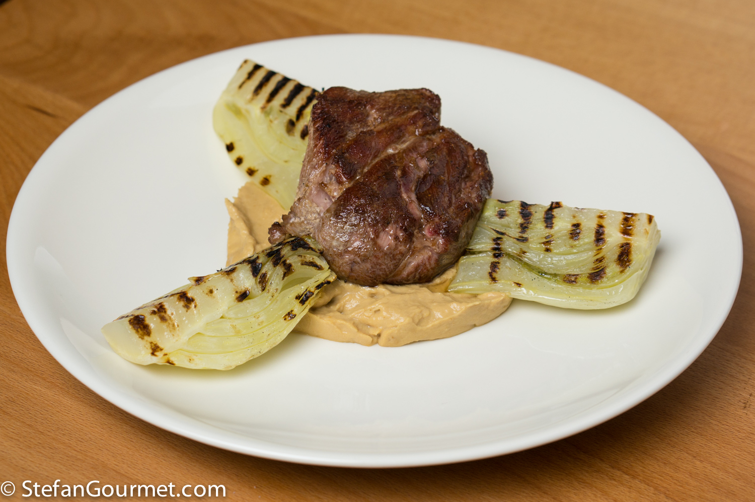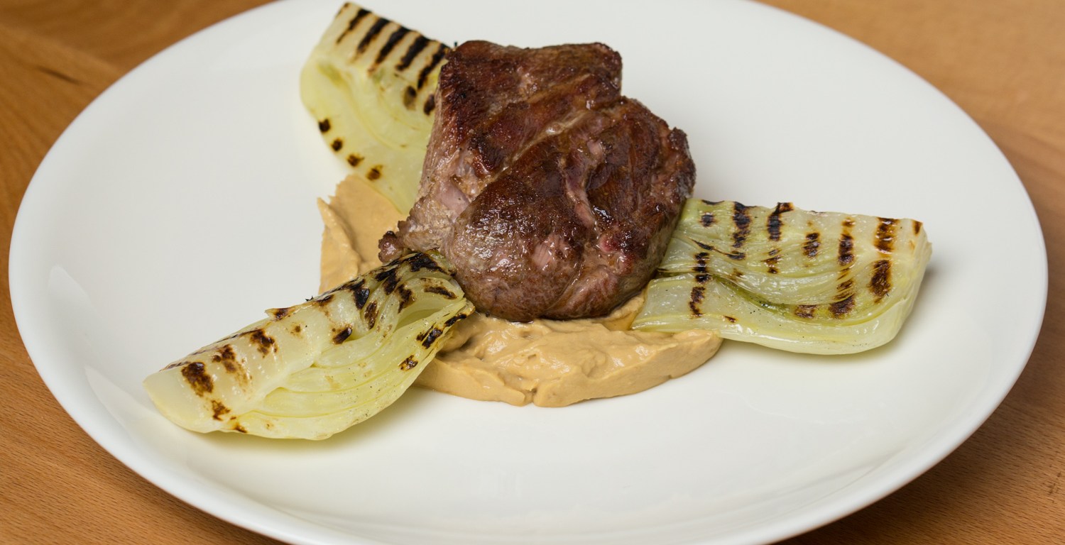 Lamb and fennel are perhaps not a very usual combination, but it does work. In this dish both the lamb and the fennel are cooked sous-vide. A flavorful piece of lamb is cooked sous-vide with yogurt and fennel seed. The fennel cooked sous-vide is briefly grilled to add some more flavor as well as some pretty grill marks. The fennel is featured in another preparation as well, braised and then pureed with some yogurt to create a velvety sauce/puree. Altogether a nice dish using only a few ingredients.