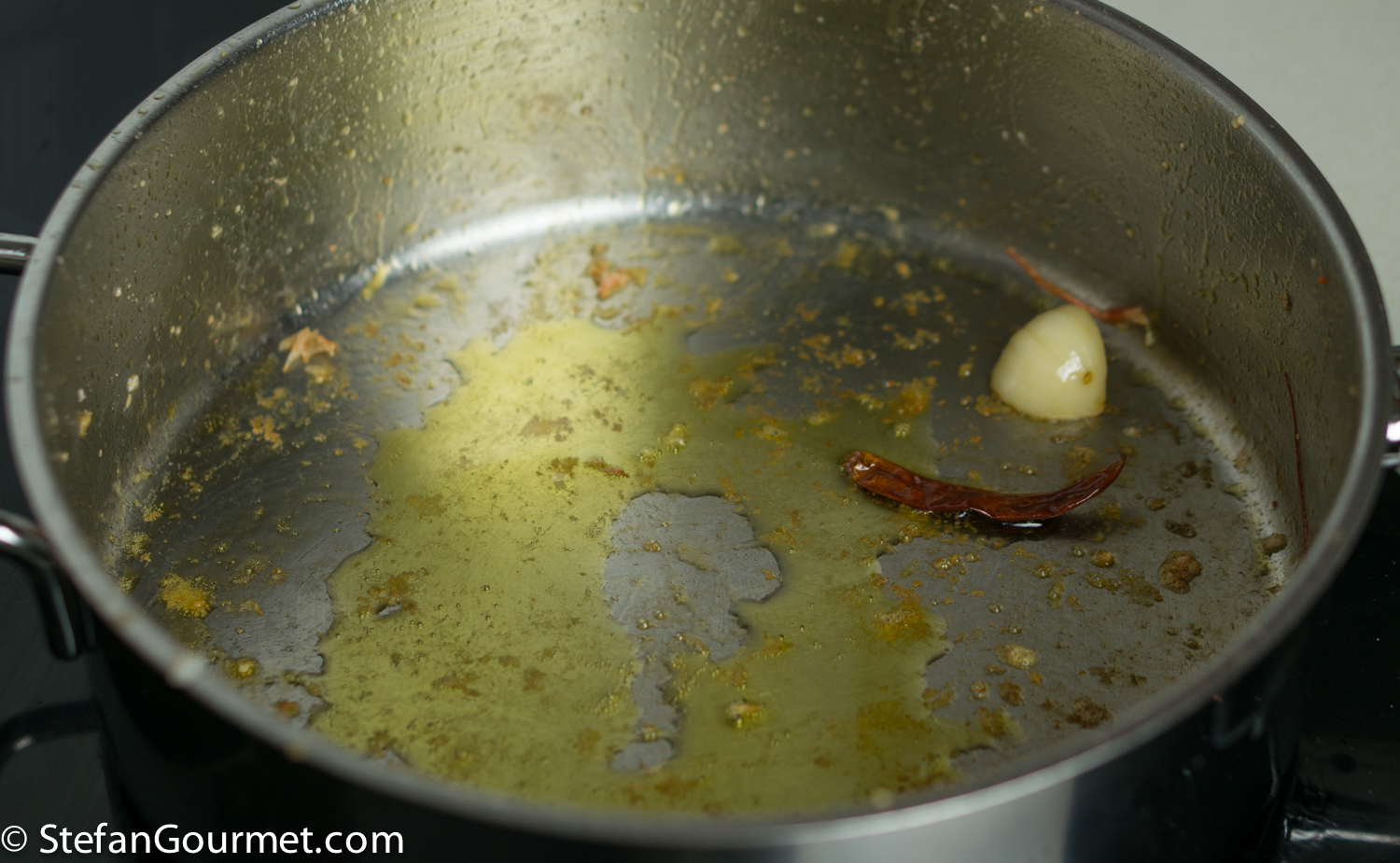 Heat a couple of tablespoons olive oil in a large frying pan and add a whole clove of garlic (peeled) and a chilli pepper. Stir them for a minute over medium high heat.