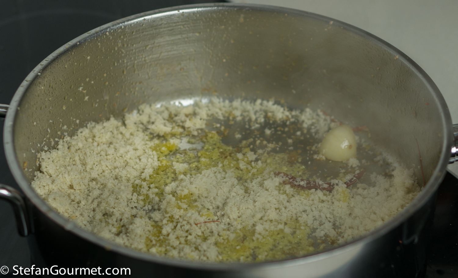 To the same pan, add 30 grams (1 oz) crumbs from day old bread.