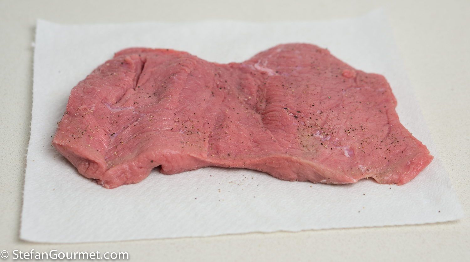 Lay out a 450 grams (1 lb) slab of tender veal that is about 1 cm (1/3 inch) thick. The veal is cut from the same cut as scaloppine, but thicker. Season with salt and freshly ground black pepper on both sides.