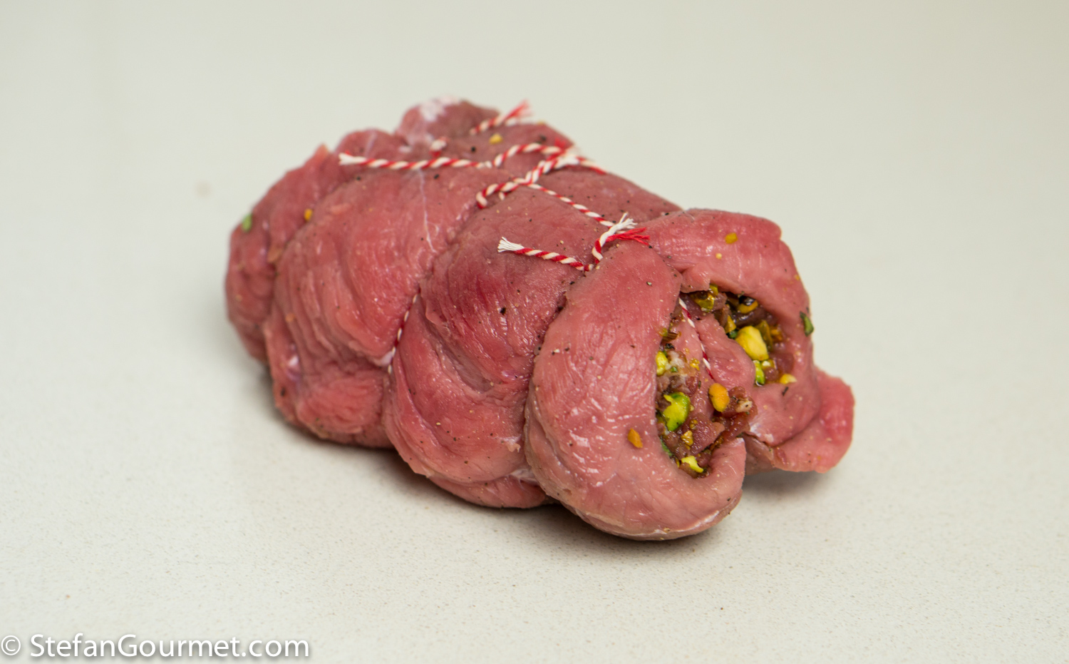 Roll up the meat, starting from the covered end, and secure the roulade with butcher’s twine.