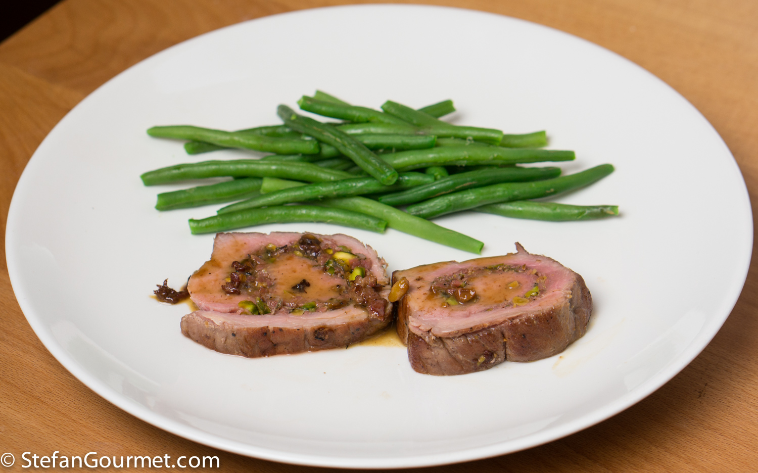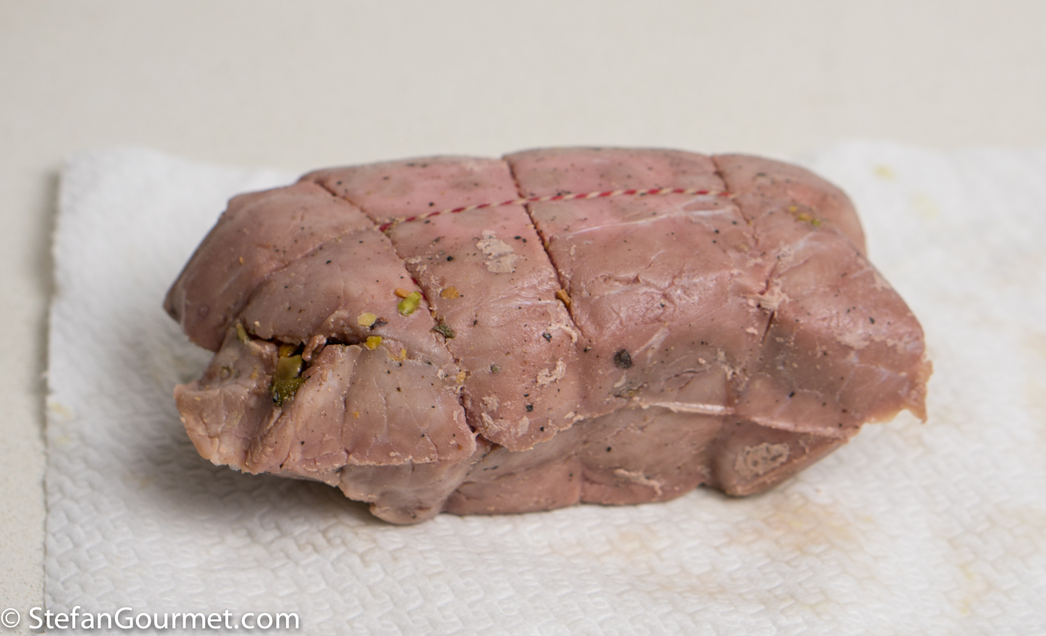This dish was inspired by a pork roulade stuffed with pistachios and prosciutto that Marina made for us when we visited. I thought it would be nice to make it with veal, and cook it sous-vide. That way, the meat is cooked perfectly from edge to edge, tender, and juicy. You could also cook this roulade in the oven, but be careful not to overcook it as that would dry it out. This was also a nice use for part of the huge chunk of prosciutto di San Daniele that we had brought home from San Daniele.