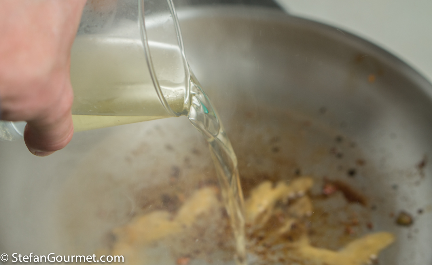 Discard most of the olive from the pan, the deglaze the pan with 80 ml (1/3 cup) dry white wine. Use a wooden spatula to stir and pick up the browned bits and pieces that are stuck to the pan.