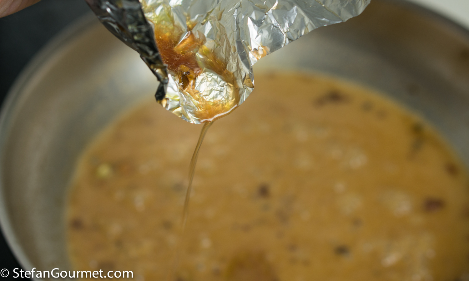 When the sauce has finished reducing, take the meat out of the aluminum foil. Add the juices that have been released by the meat to the sauce. (We never waste any flavor!)