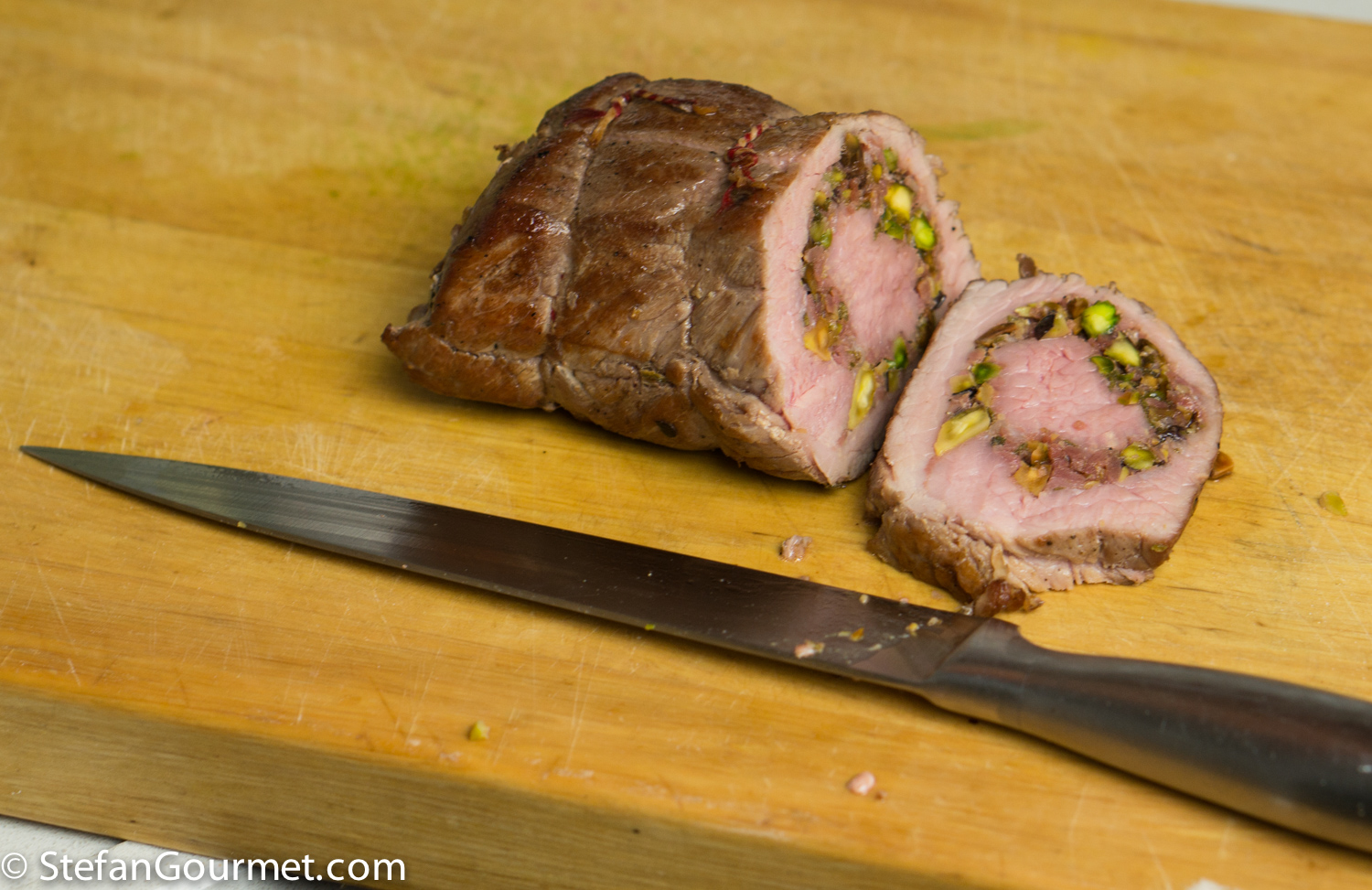 Remove the butcher’s twine and slice the roulade.
