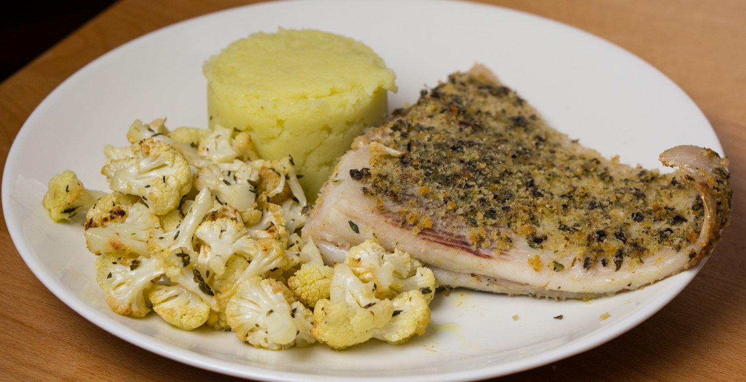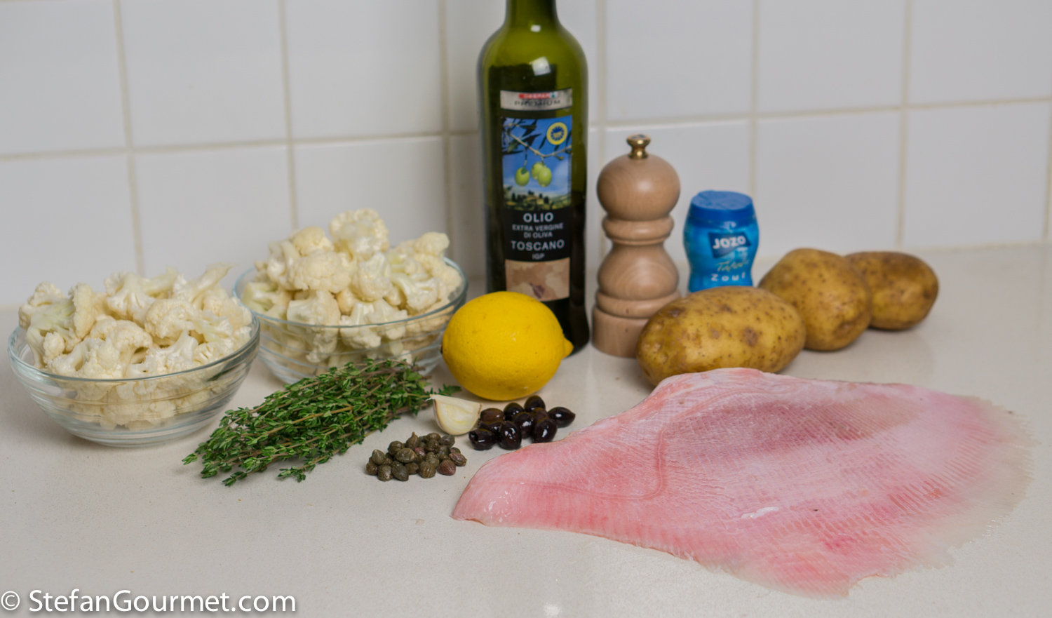 I hadn’t prepared skate in a while, and in fact I hadn’t prepared it for at least four years as there is no mention of it on the blog (and the 4th anniversary of this blog is approaching quickly). I thought it would be nice to prepare it in Italian style, probably because I usually think it is nice to prepare everything in Italian style 😉 I cooked the skate in the oven with a crust of breadcrumbs, capers, olives, lemon zest, thyme and garlic. And since I was using the oven anyway, I decided to slow-roast some cauliflower to go with it. To complete the meal, I made some mashed potatoes. Also in Italian style, with extra virgin olive oil instead of butter. It turned out to be a delicious meal. If you can get skate, you should prepare this too. You won’t regret it.