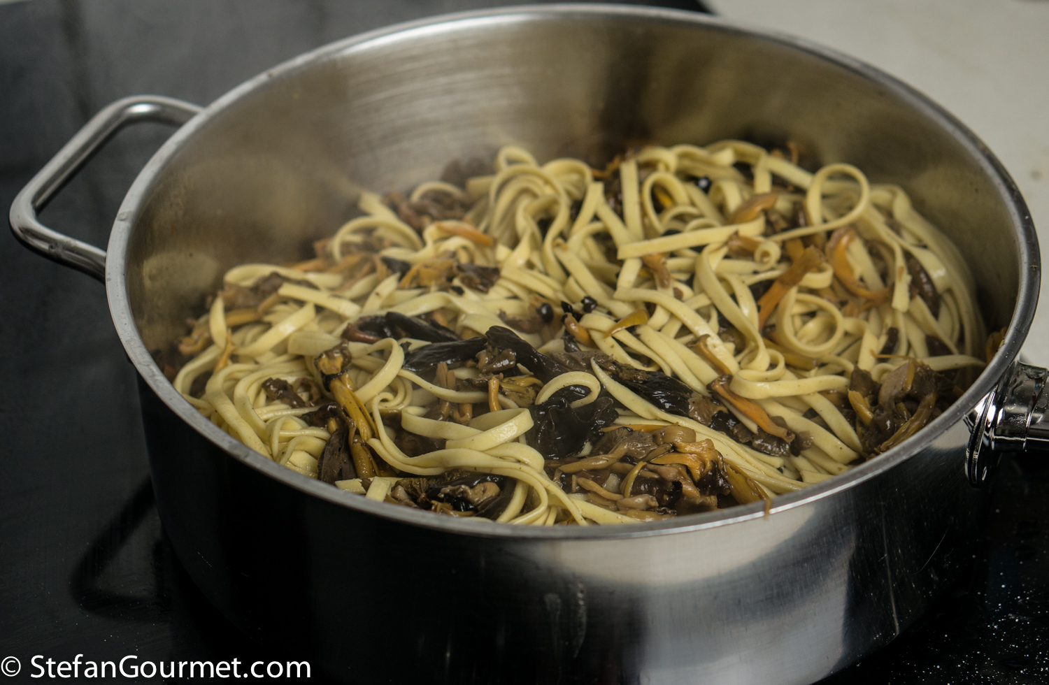 When the water boils, add salt and the tagliolini. Cook for about a minute, drain, and add to the mushrooms. It may be a good idea to reserve some of the pasta water to add if the pasta becomes too dry. Toss to mix.