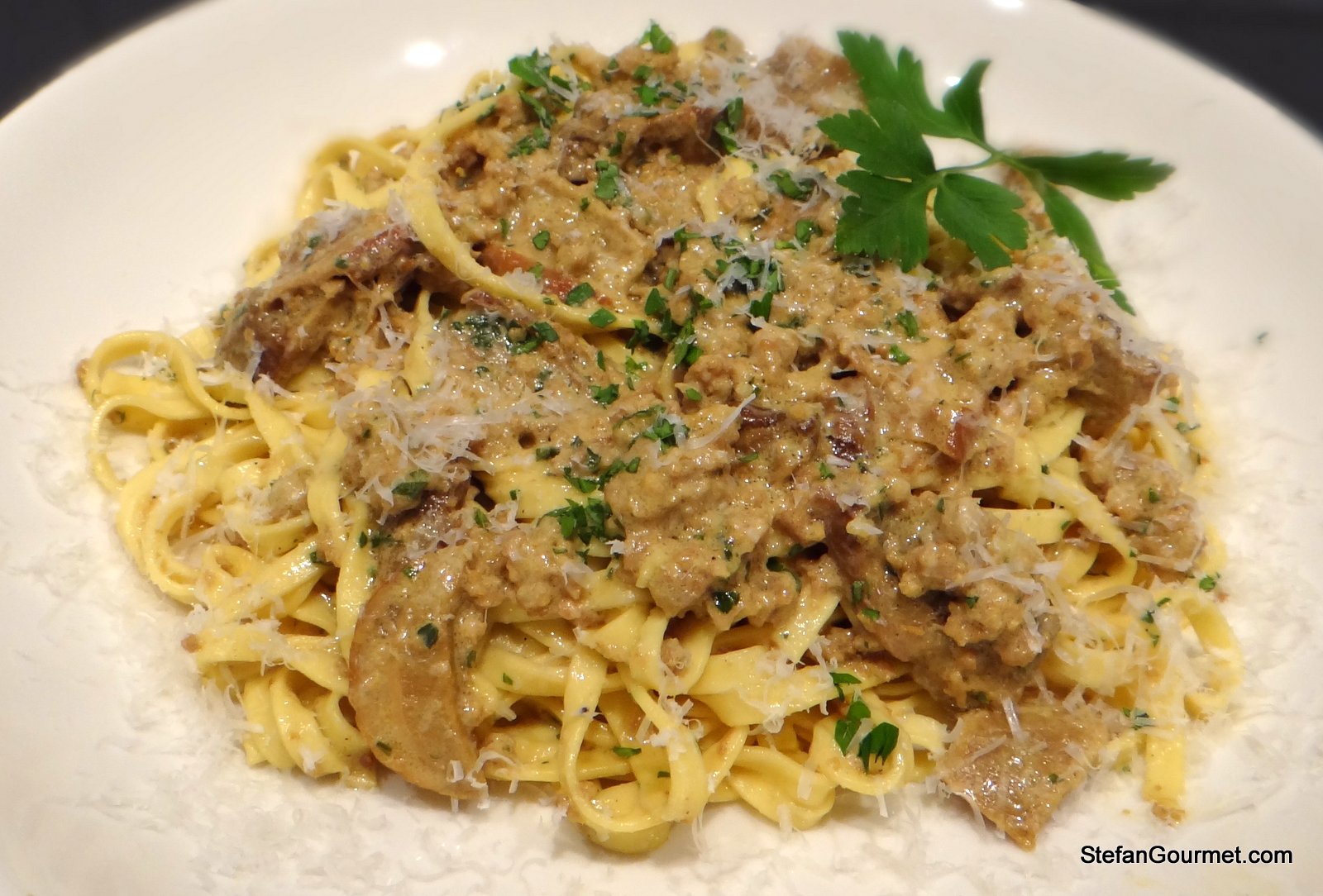 Fresh pasta with sausage, dried porcini mushrooms, and cream is a wonderful combination of flavors.
