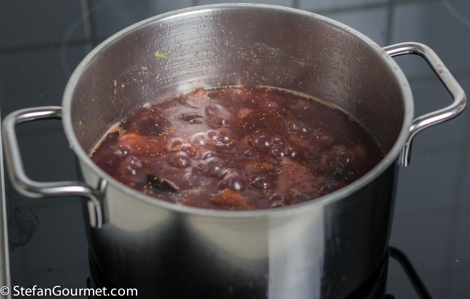 I started following the blog when I found this very inspired recipe for using the figs that grow in my backyard. I made fig one day and peach the next. I have two comments: you can use much less water (like 15 ml) if you use a very heavy bottomed pan, and turn to low heat, and wait for the fruit to release its juice (something you are probably familiar with if you make jam). Also, I would add lemon zest at end of cooking, to keep it sharp.