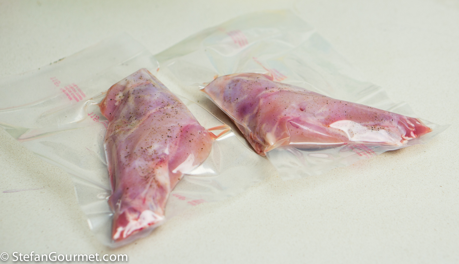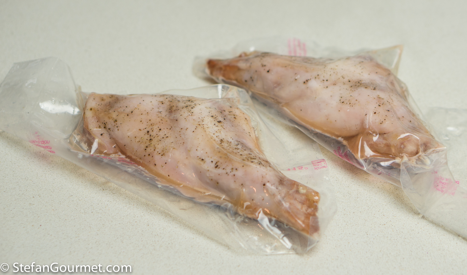 Season the rabbit legs with salt and freshly ground black pepper. Vacuum seal them individually.