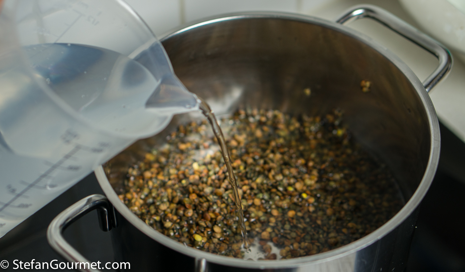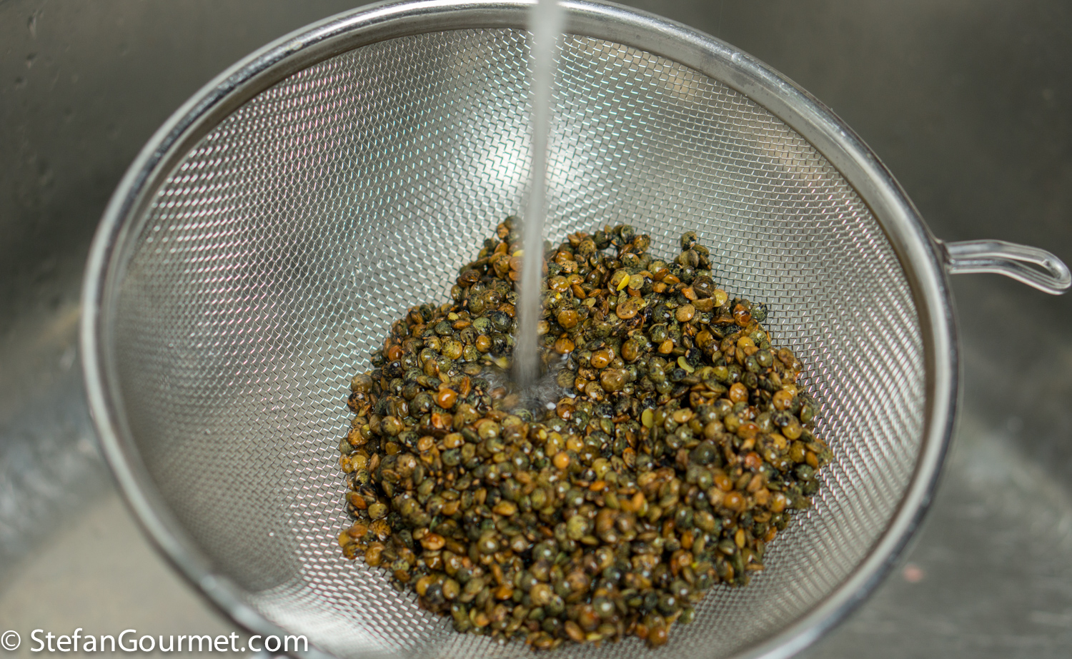 Meanwhile, rinse 120 grams (2/3 cups) of lentils in cold water. There is no need to soak them.