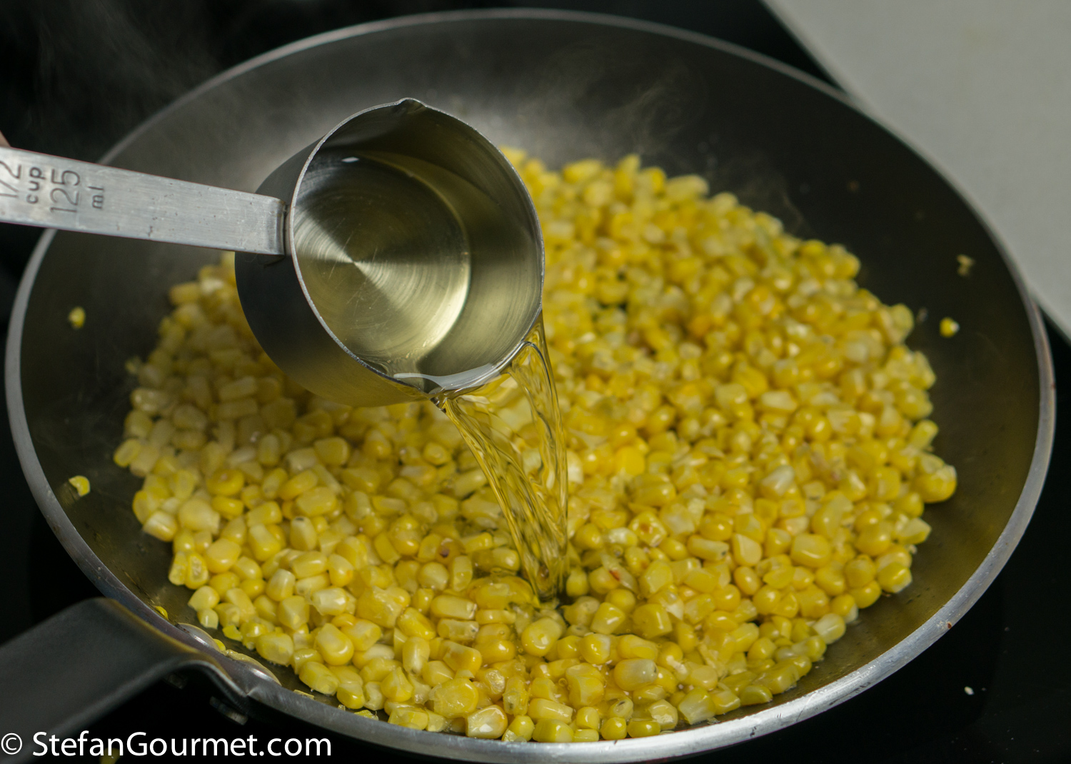 Bring to a boil, reduce the heat, and simmer until the wine has evaporated and the corn is tender but firm to the bite. Turn off the heat and allow the corn to cool off to room temperature.