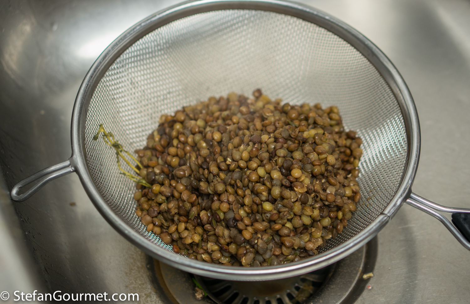 When the lentils are cooked, drain them and discard the garlic and thyme. Allow the lentils to cool to room temperature.