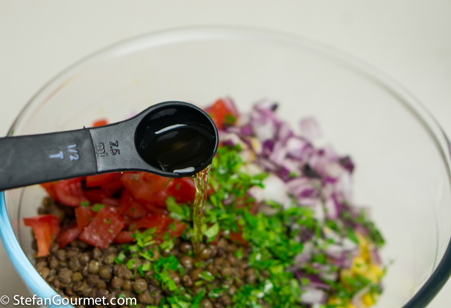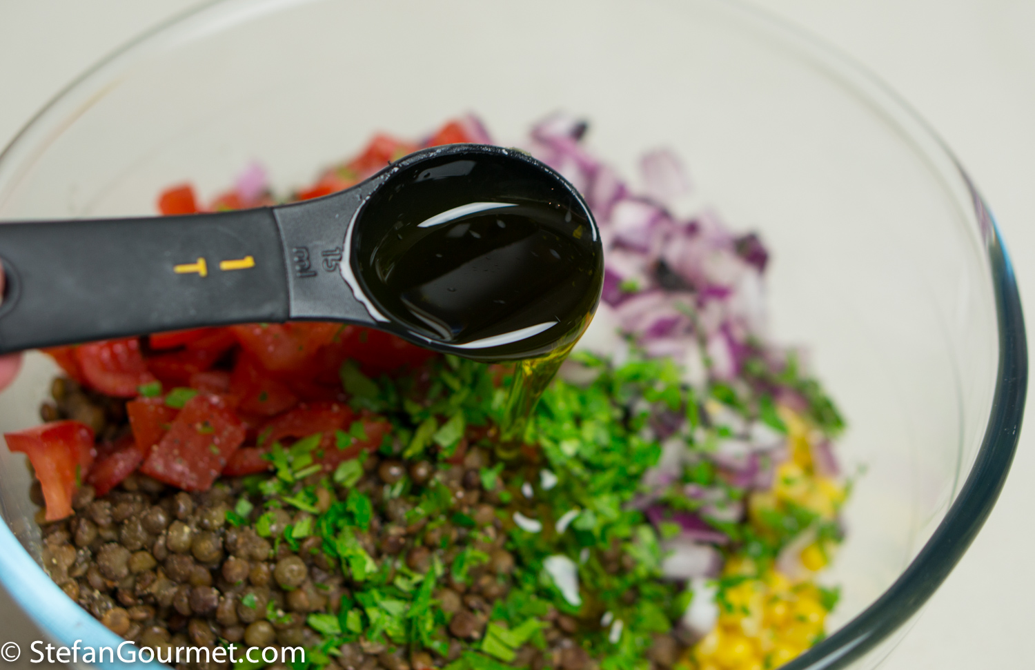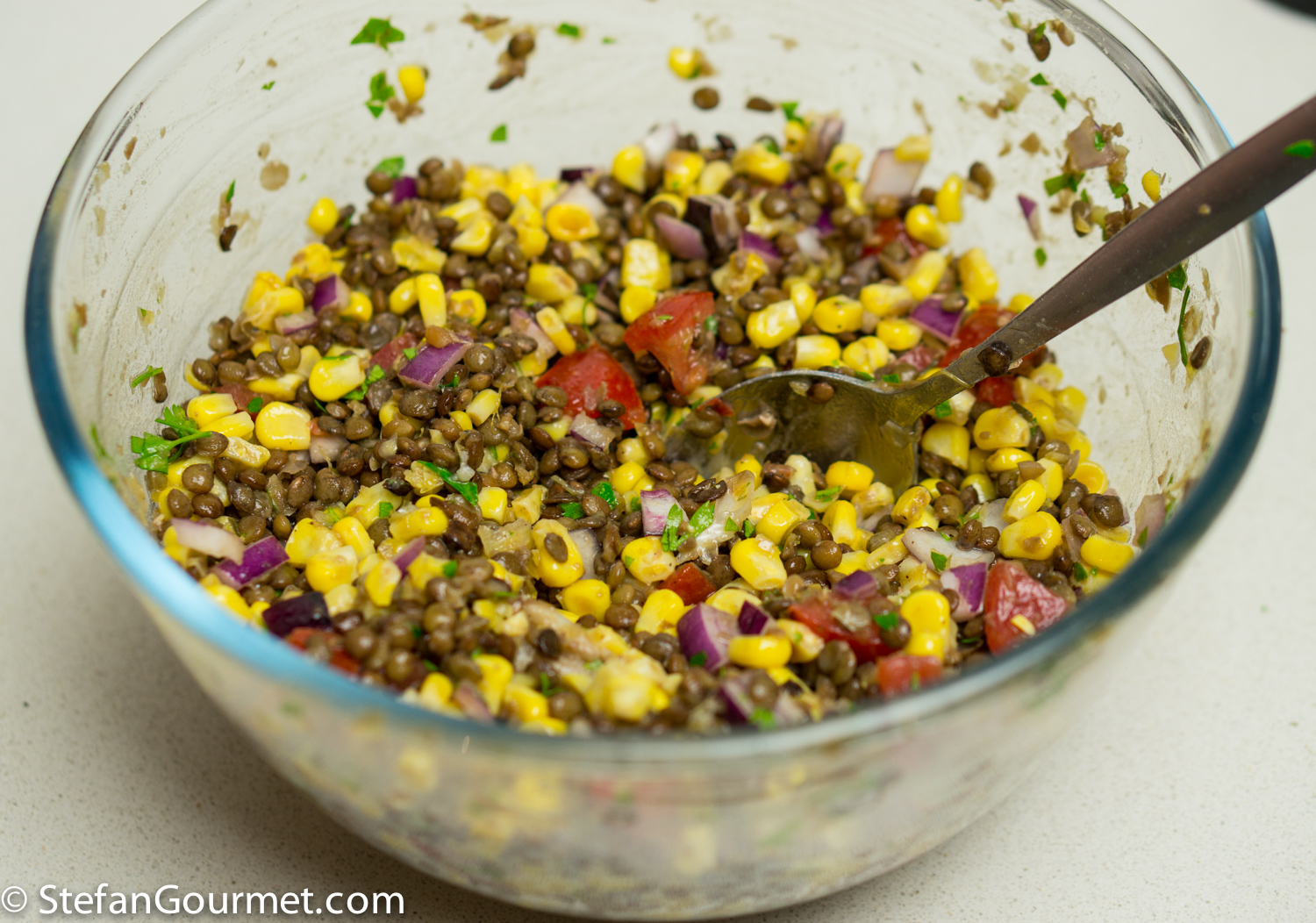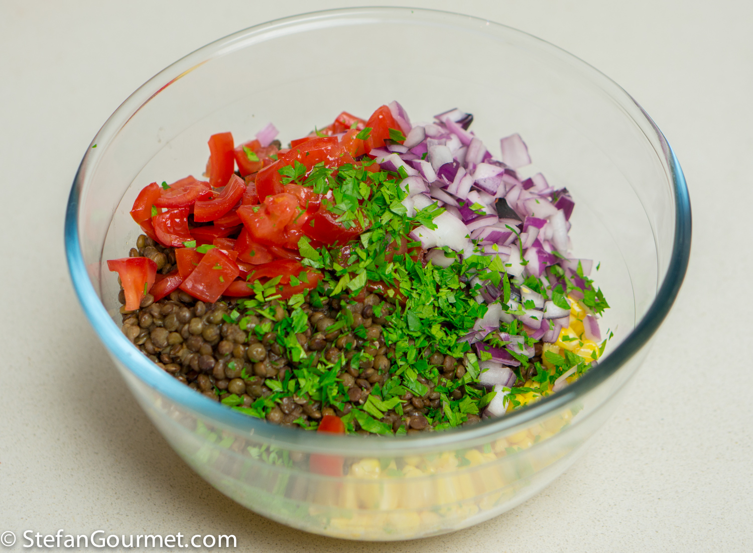 When the lentils and corn have cooled off, combine them in a large bowl together with 50 grams of minced red onion, 100 grams of seeded and diced tomato, and a tablespoon of minced parsley.