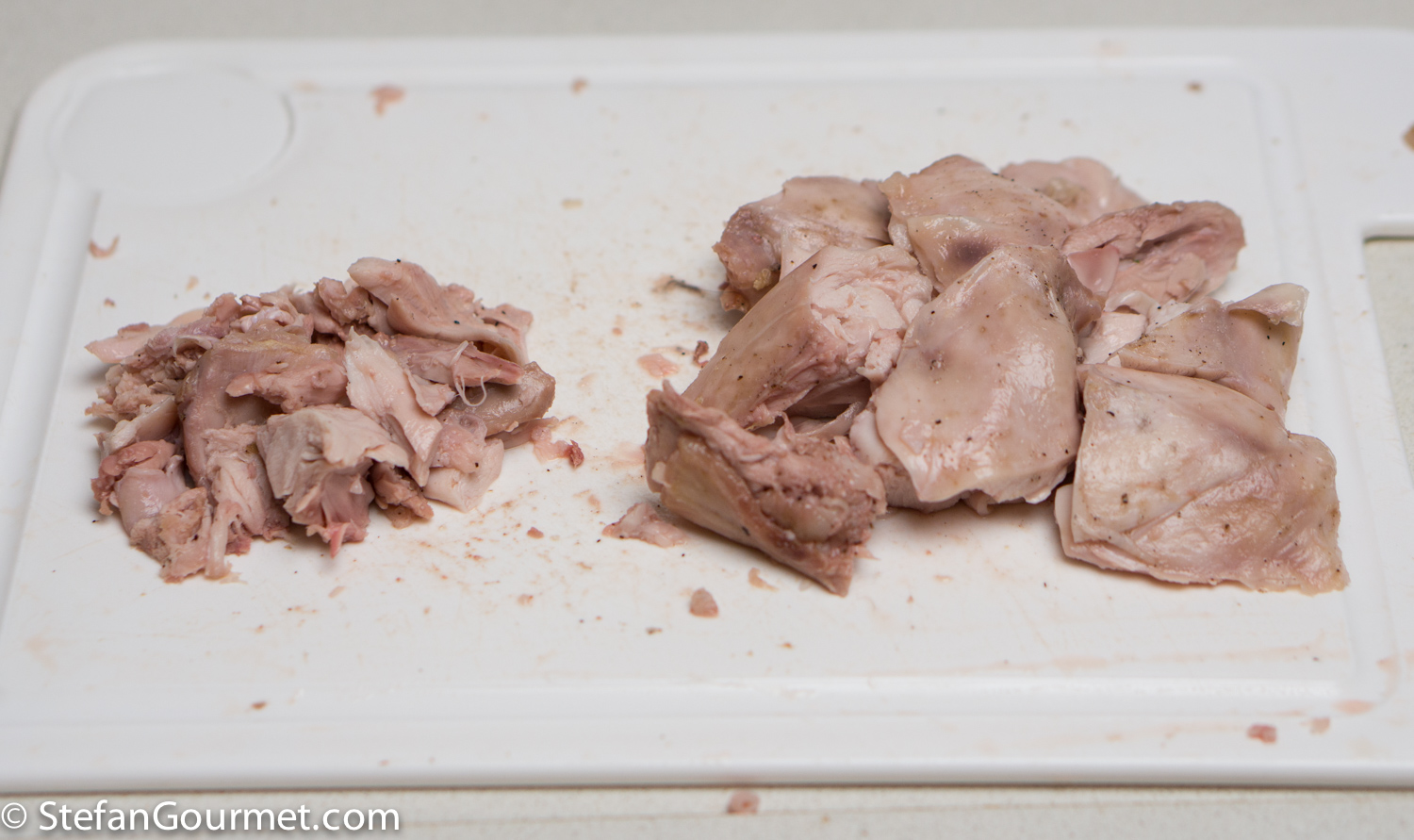 Cut the meat off the bones (the meat will not fall off the bone because we’d like to keep it juicy). Try to do this in larger pieces, but there will be some smaller pieces as well.