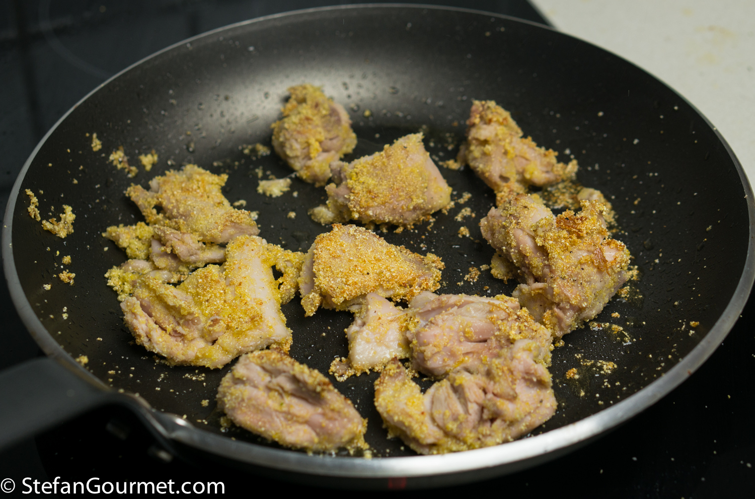 Heat 3 tablespoons clarified butter in a non-stick frying pan and brown the corn-coated rabbit pieces in batches.