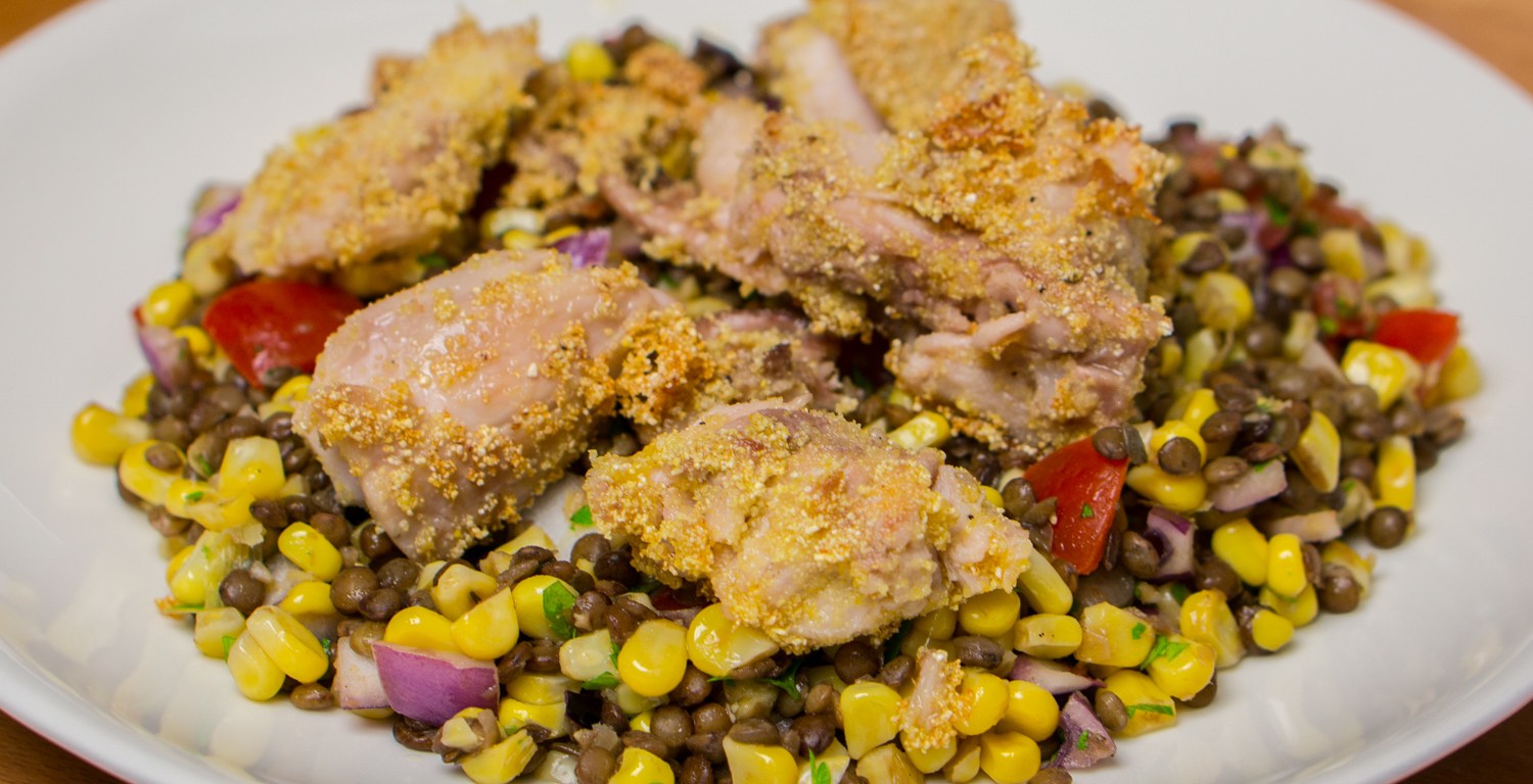 This is an original dish that I created based on what I had in my fridge and pantry. Succulent morsels of rabbit with a crispy crust are served atop a flavorful and healthy lentil and corn salad with tomatoes and red onions. For the crust on the rabbit I used cornmeal to echo the corn in the salad. The rabbit is served hot, the lentil salad at room temperature. It makes for a nice contrast between flavors, temperatures and textures. And it is low in fat and high in protein and fibers. But most importantly, it is delicious.To serve rabbit this way, a sous-vide is a great help to get it tender and keep it juicy. You could substitute the rabbit with chicken, which is easier to obtain and easier to cook. But not as delicious. Here’s what I did…