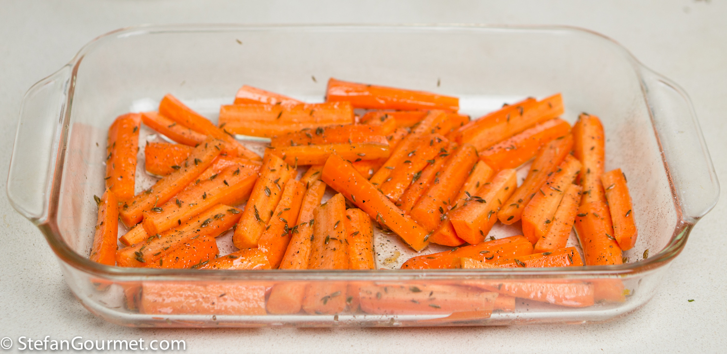 Put the carrots in the oven dish with the coconut oil, add a teaspoon of cumin seeds, and toss to coat the carrots with the cumin seeds and coconut oil.