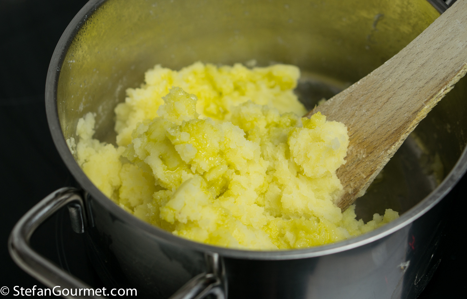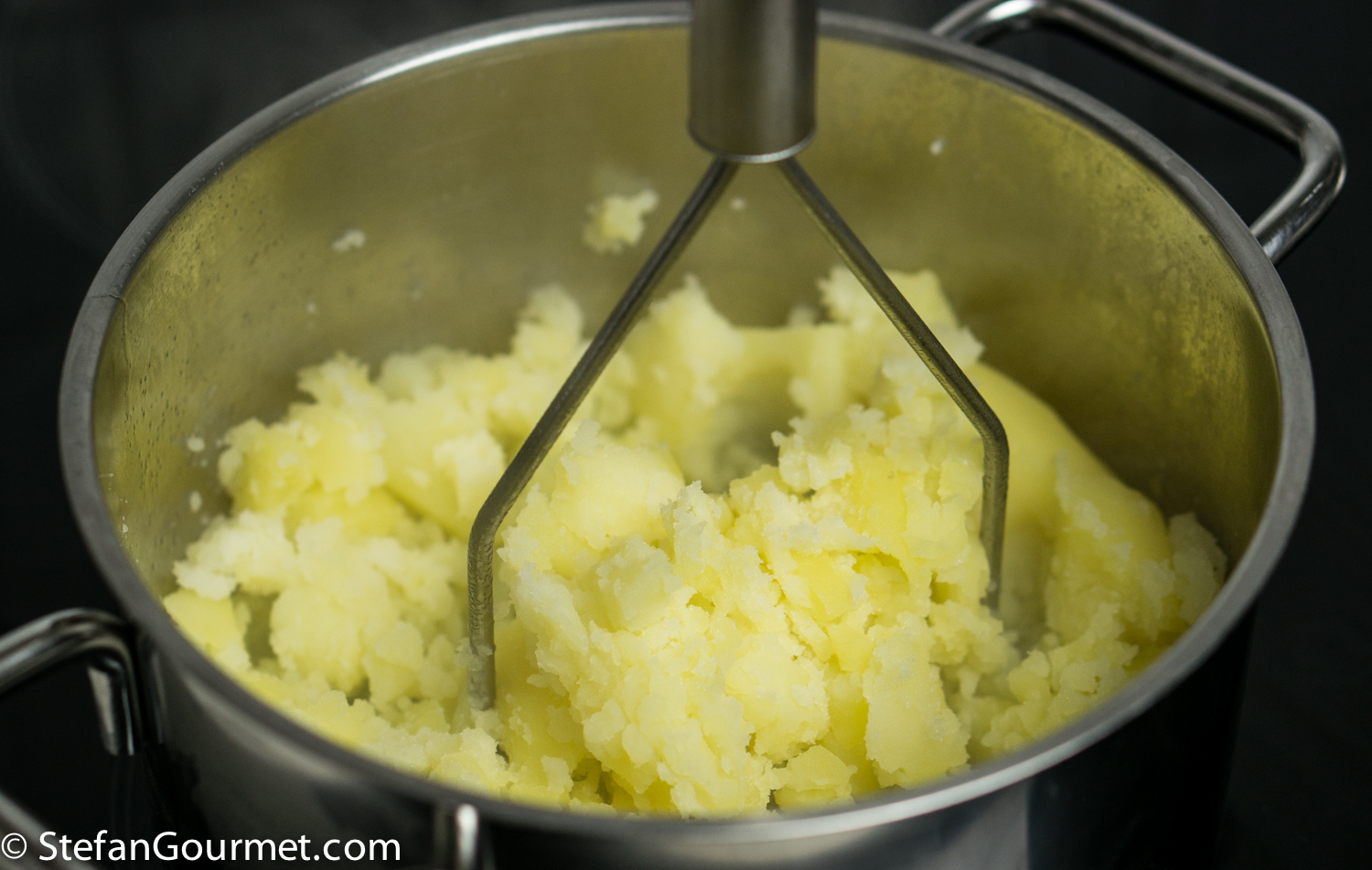 When the potatoes are tender, drain them, but leave a few tablespoons of the cooking water, and mash them.