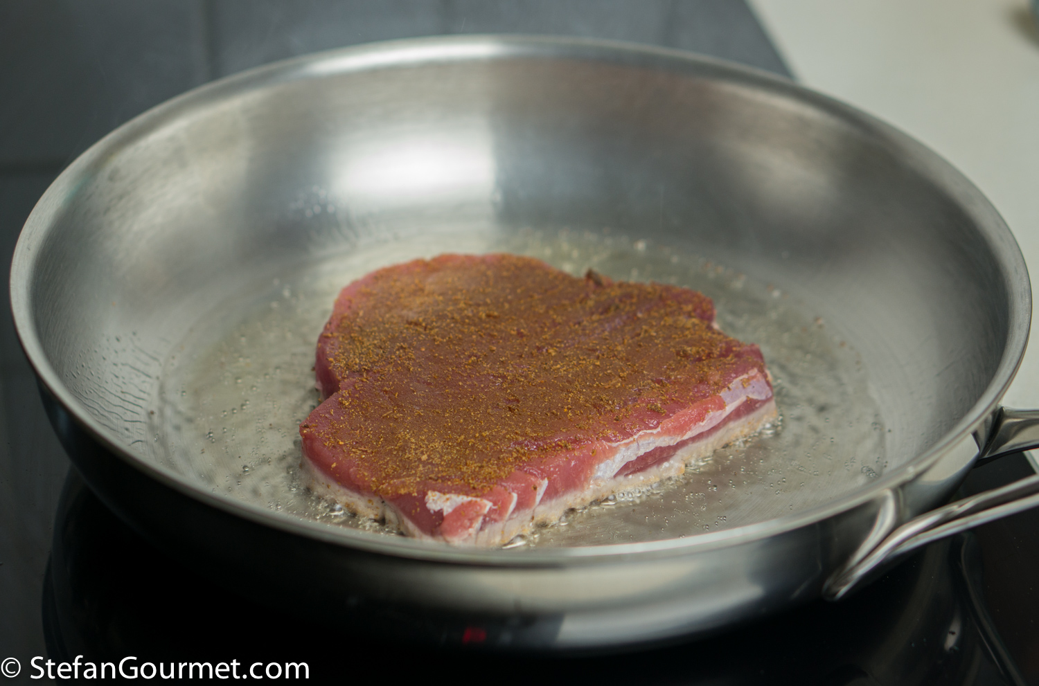 Preheat a frying pan to get it very hot. Add two of coconut oil to the hot frying pan, and then the tuna. Cook for about 30 seconds over very high heat.